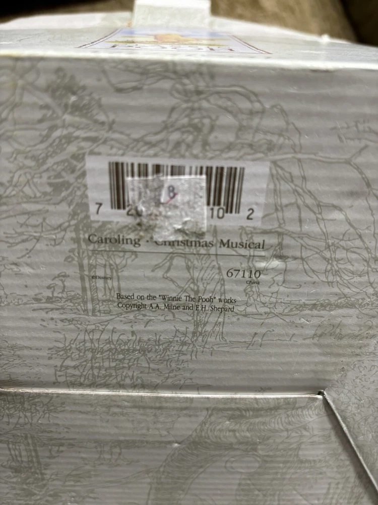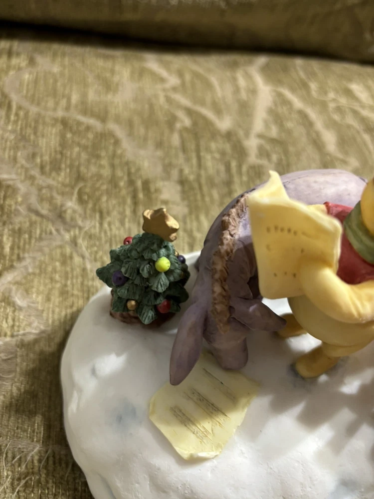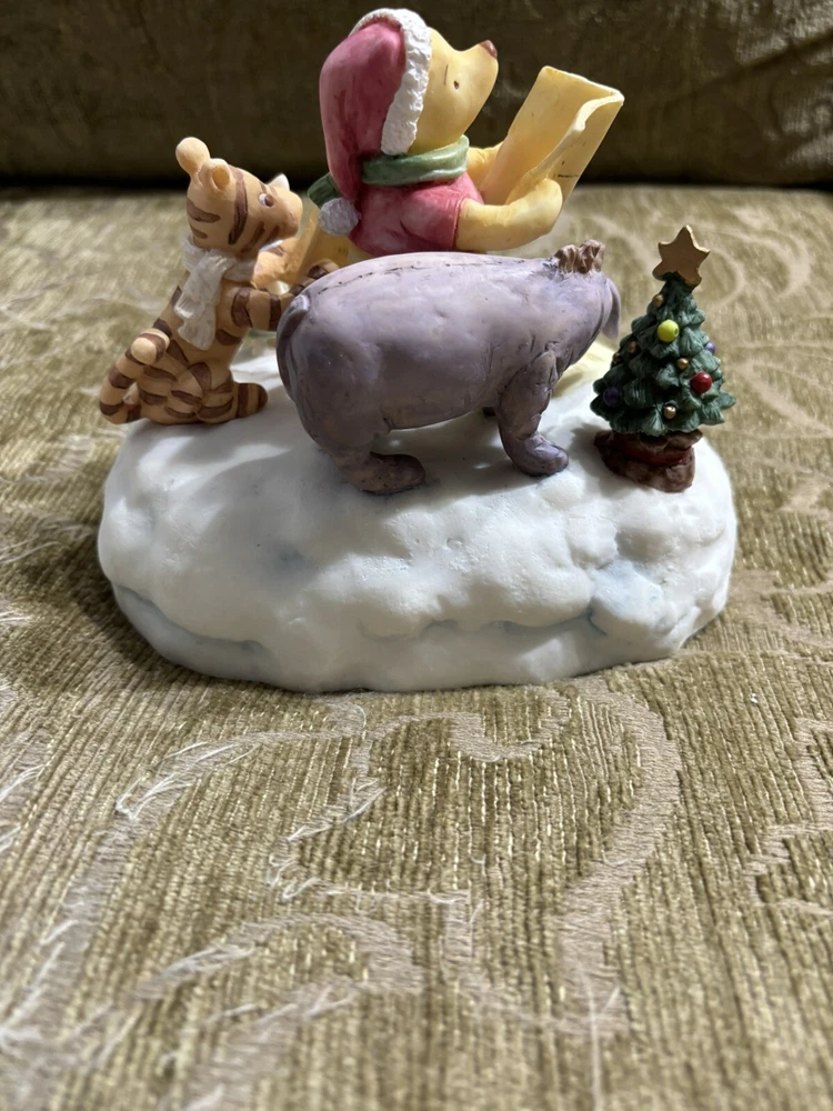 This Charpente Christmas Caroling Classic Pooh Musical Figurine Sculpture is a must-have for any Disney or Winnie the Pooh fan. The beautifully crafted figurine features Pooh and his friends caroling in classic holiday attire, with a musical tune that adds to its charm. The sculpture is made by Charpente, a renowned brand in the collectibles industry. It is a perfect addition to any collection, and is sure to bring joy and nostalgia to anyone who sees it. Get this unique piece now and add a touch of holiday magic to your home or office. In good shape. Could use a good cleaning. Comes with the bad as shown. Box is not in perfect shape as shown.