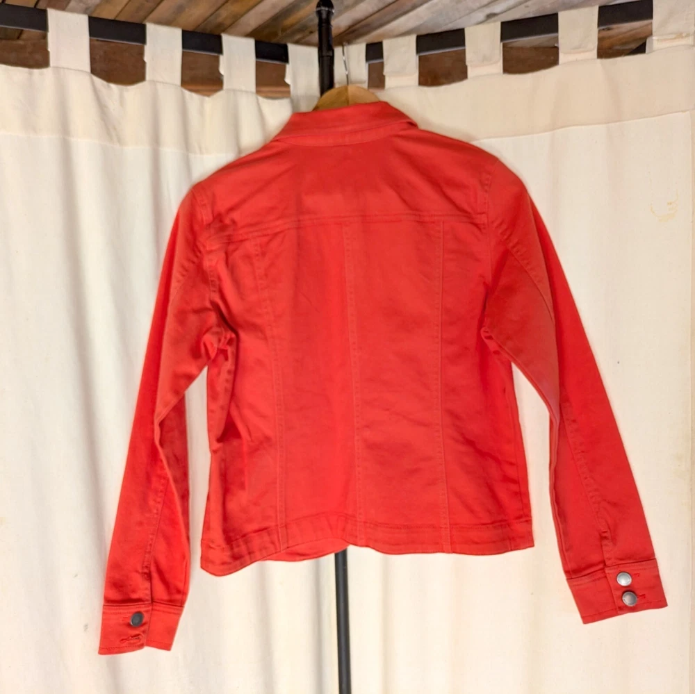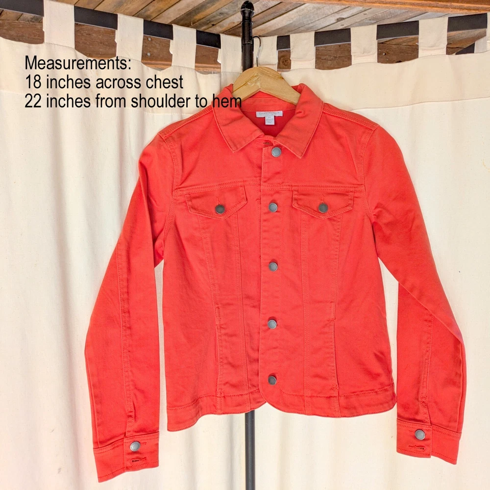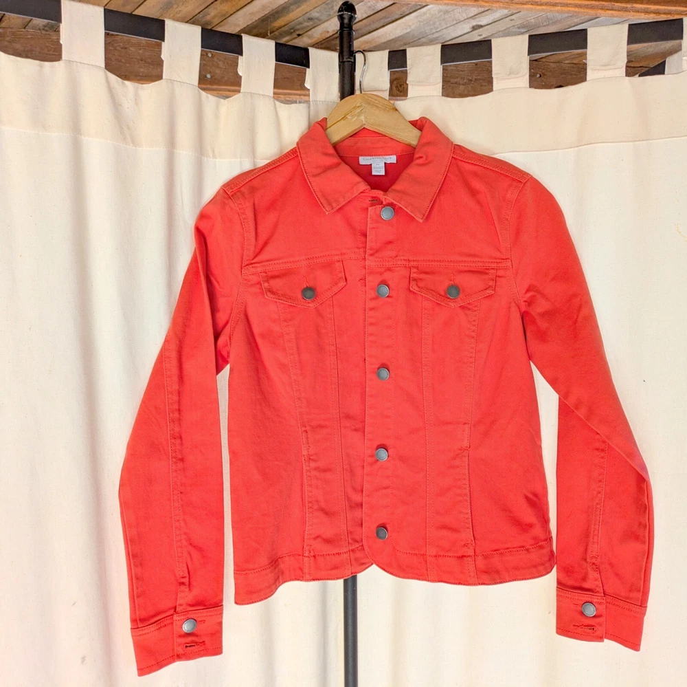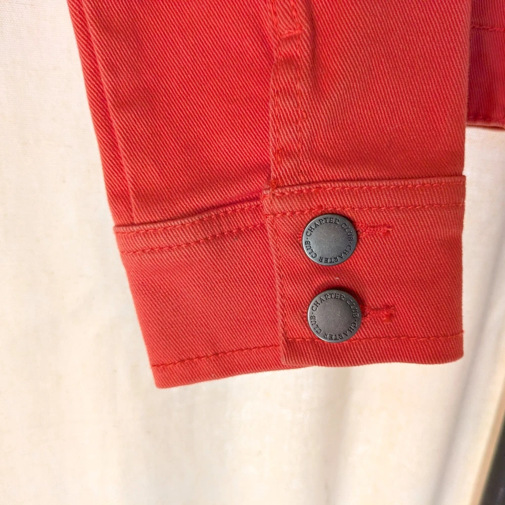 Charter Club Denim Jacket Orange/Coral Size Petite Small Classic Casual Excellent condition. No flaws 90's style classic denim jacket with grommet buttons Great for casual wear or to elevate any outfit to classic styling Beautiful orange/peach color. Measurements: 18 inches across chest 22 inches from should to hem