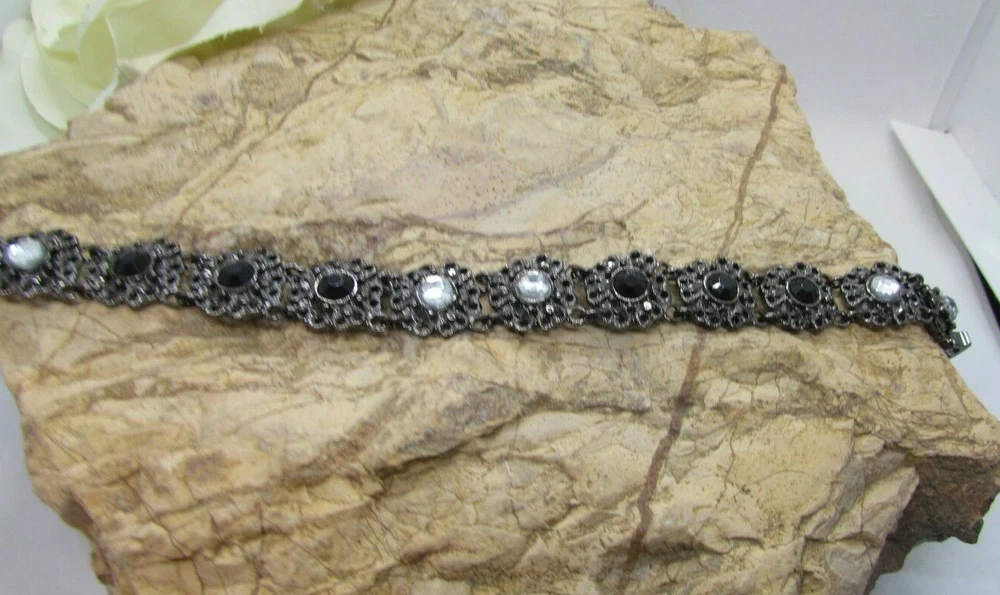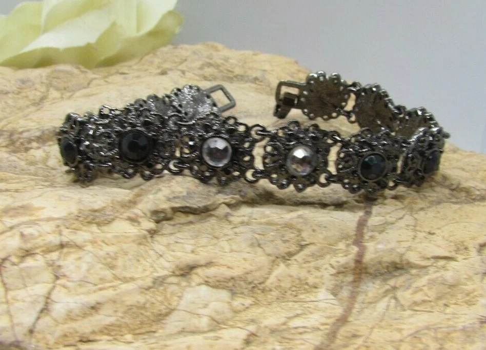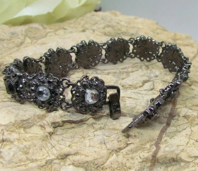 Charter Club Filigree Bracelet Black Crystal Gun Metal 7"