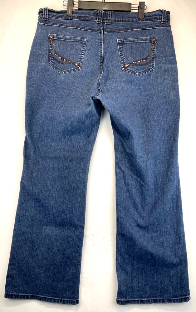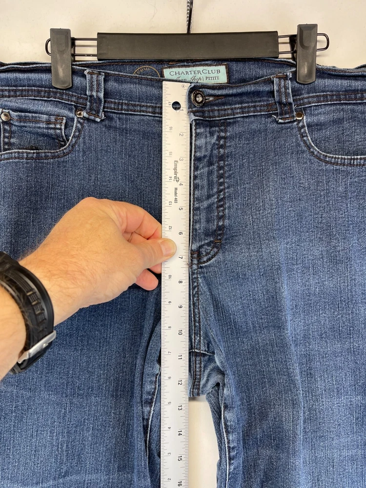 Style: Bootcut Inseam: 28.5 in Size: 16P Pattern: Solid Material: Cotton, Polyester, Spandex Brand: Charter Club Size Type: Plus Theme: City, College, Cowboy, Preppy Personalize: No Handmade: No Type: Jeans Pocket Type: 5-Pocket Design Fabric Type: Denim Waist Size: See photos for measurements Closure: Button, Zip Features: Comfort, Easy Care, Slimming, Stretch Seller Notes: “Very good preowned condition with normal preowned wear and no issues. Please see all photos.” Garment Care: Machine Washable Fabric Wash: Medium Department: Women Color: Blue Fit: Slim Rise: High (Greater than 10.5 in) Season: Fall, Spring, Summer, Winter Accents: Button, Embroidered Country/Region of Manufacture: China