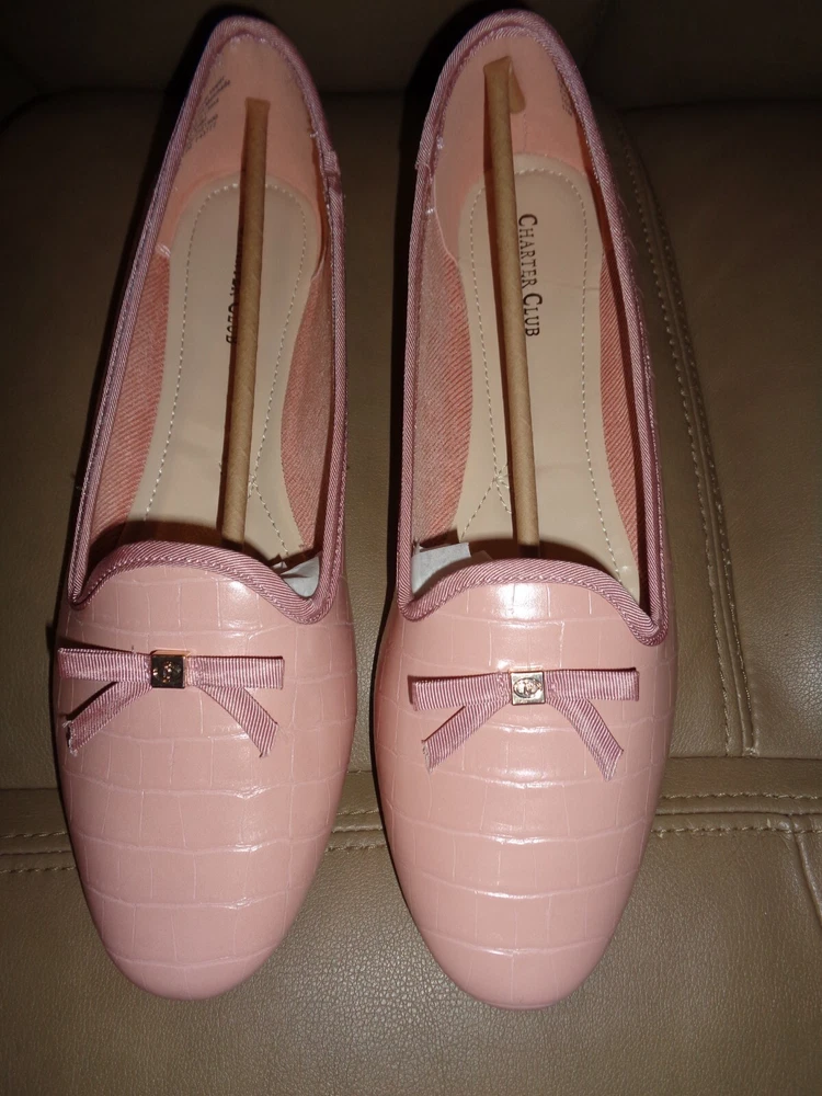 Charter Club Kimii Blush Pink Croc Embossed flats are women's shoes in size 11 medium. They are designed for various occasions like travel, party, casual wear, work, or business. The flats feature a cushioned insole and are made of faux leather with a fabric lining. The outsole material is synthetic, giving the shoes a stylish yet comfortable appeal. Retail $59.50 Any questions? Please ask.