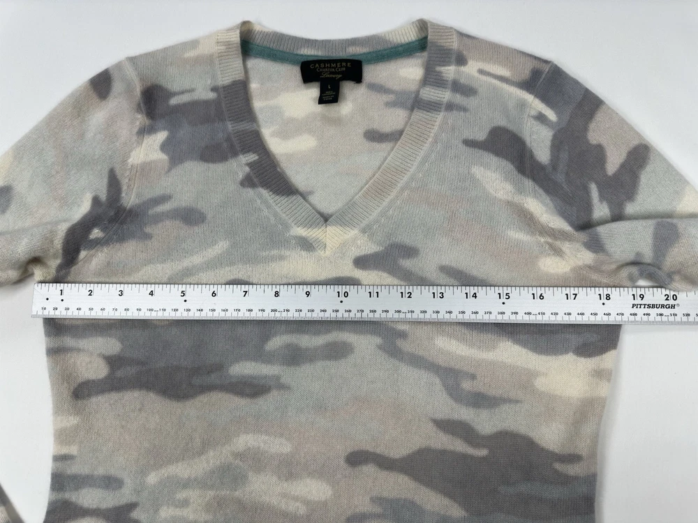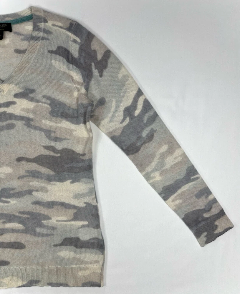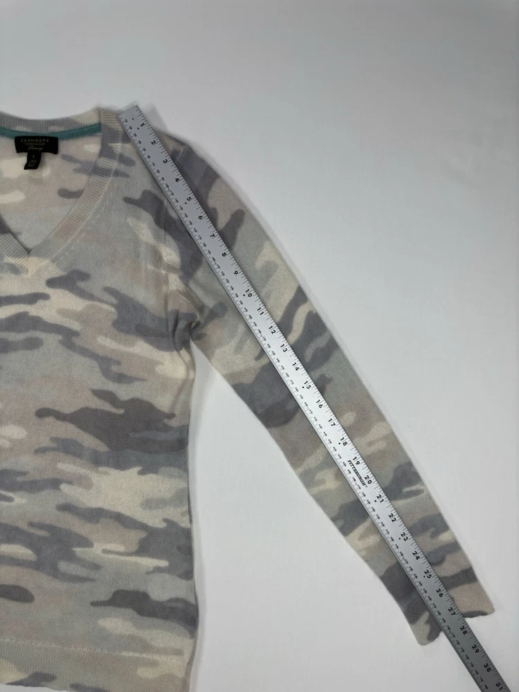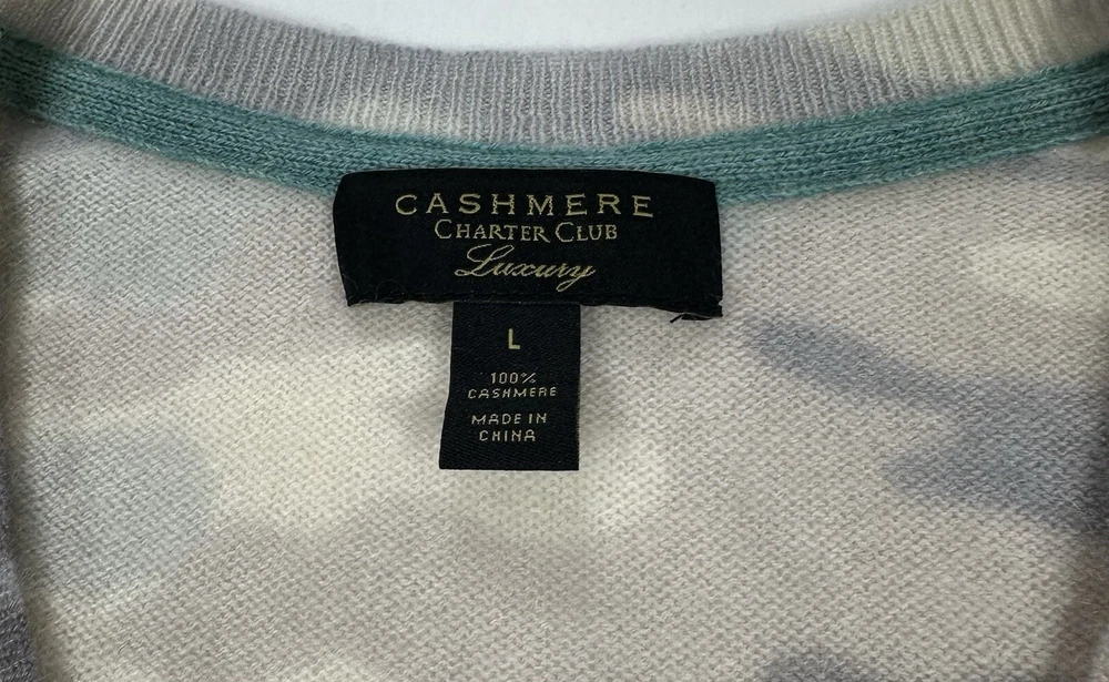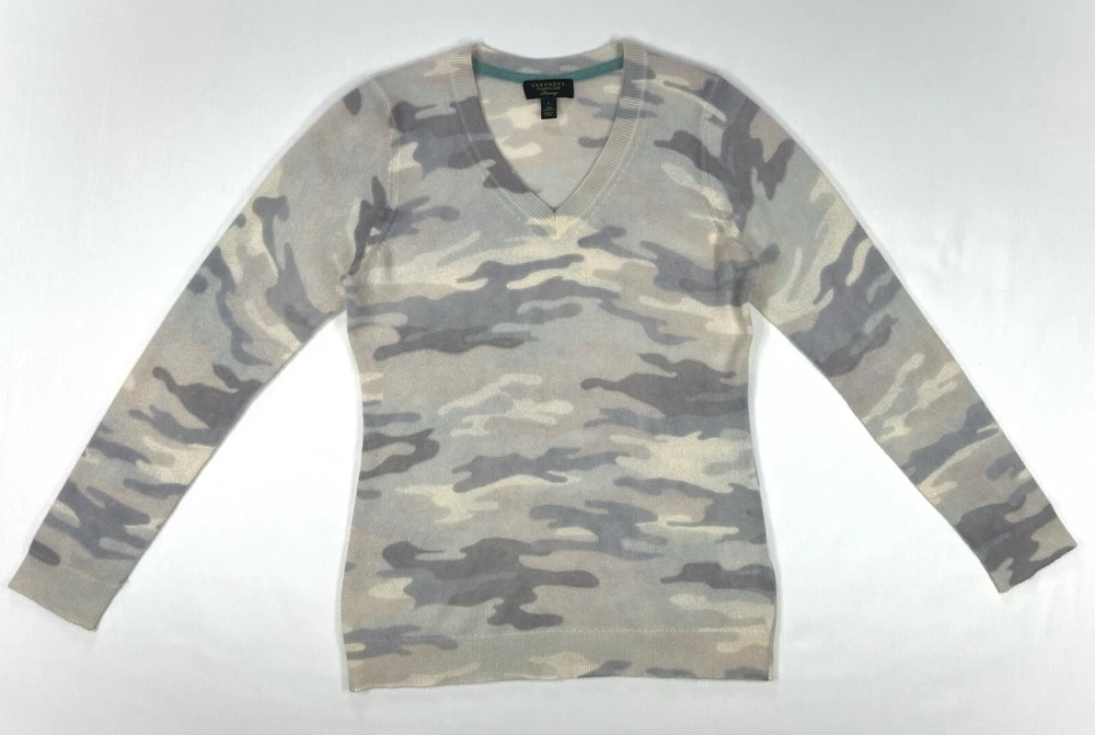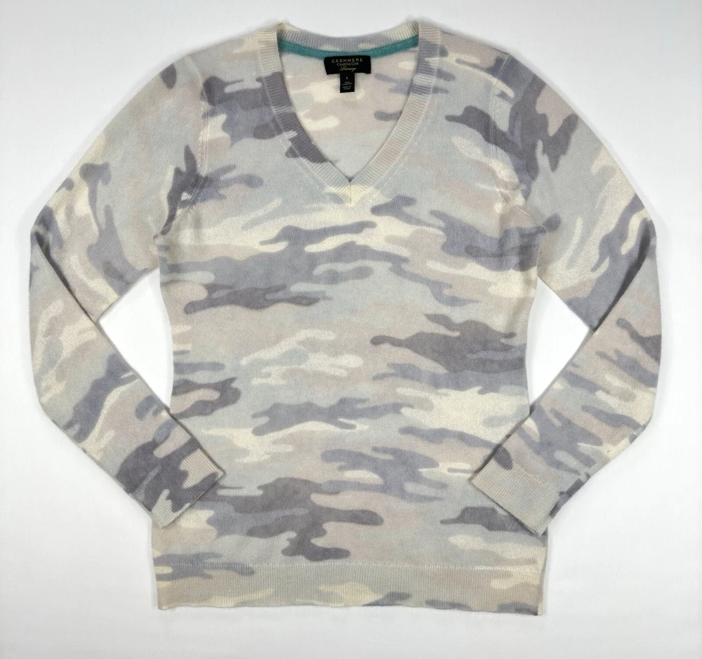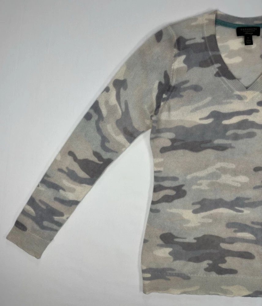 Size: L Color: Gray Type: Sweater Size Type: Regular Theme: Colorful Neckline: V-Neck Style: Pullover Pattern: Camouflage Material: 100% Cashmere Department: Women Brand: Charter Club