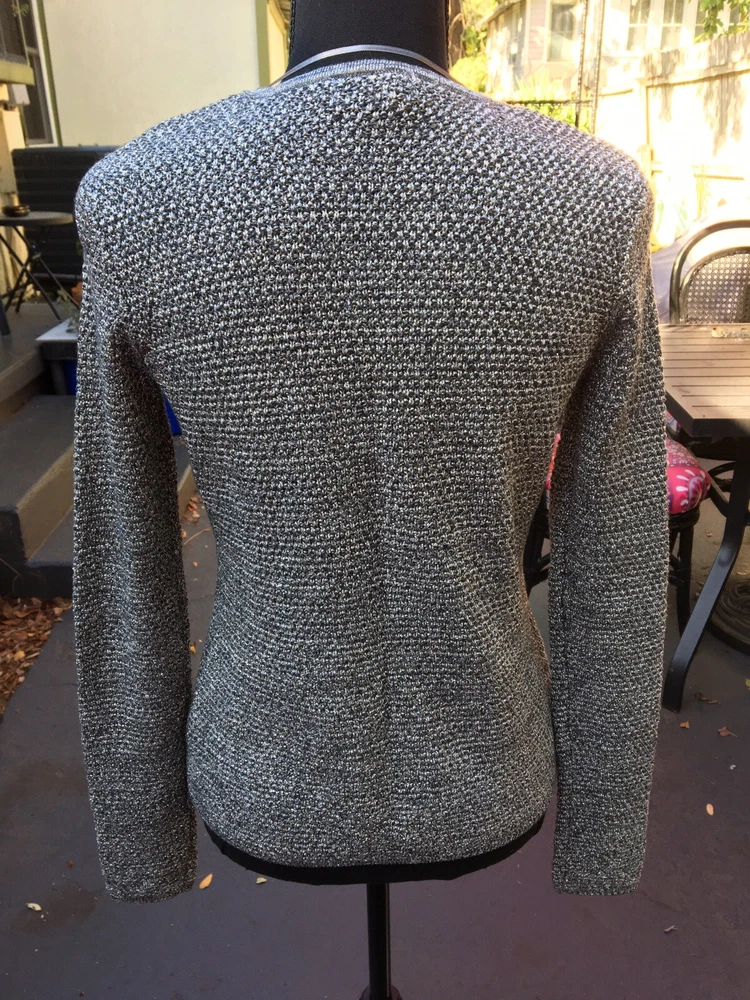 This Charter Club sweater is a stunning addition to any wardrobe, with its metallic silver and gray cotton fabric knit in a solid pattern. The long-sleeve cardigan has a round neckline and hook and eye closure accents. It's perfect for formal occasions, weddings, or cocktail parties, and the reflective material makes it a great choice for all seasons. The sweater fits regularly and is available in size P/P for petites. The brand is well-known for its quality and style, and this sweater is no exception. 51% cotton, 32% polyester and 11% metallic. 34” chest, 31” waist, 22” from shoulder to hem and 24.5” sleeves. Hook and eye closure.