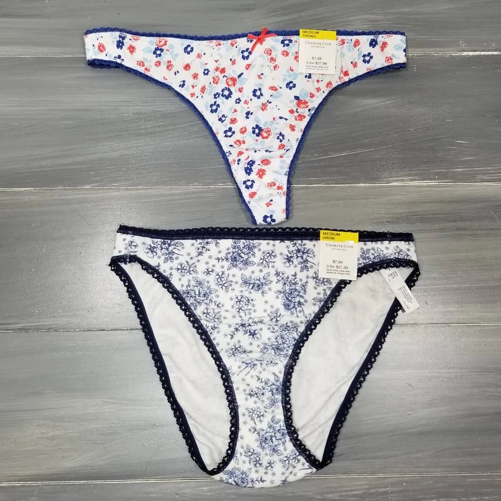 Charter Club 1 Thong, 1 Bikini, Size Medium Bikini 100% Cotton, Color: Angel White Thong 100% Cotton, Color: Blooming Flora New with tags. Paper hang tag may be torn or have tape or stickers attached/detached Inv: G208