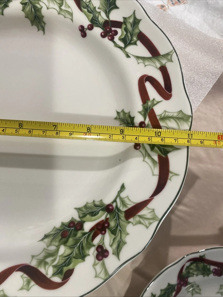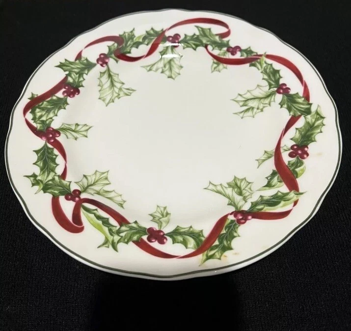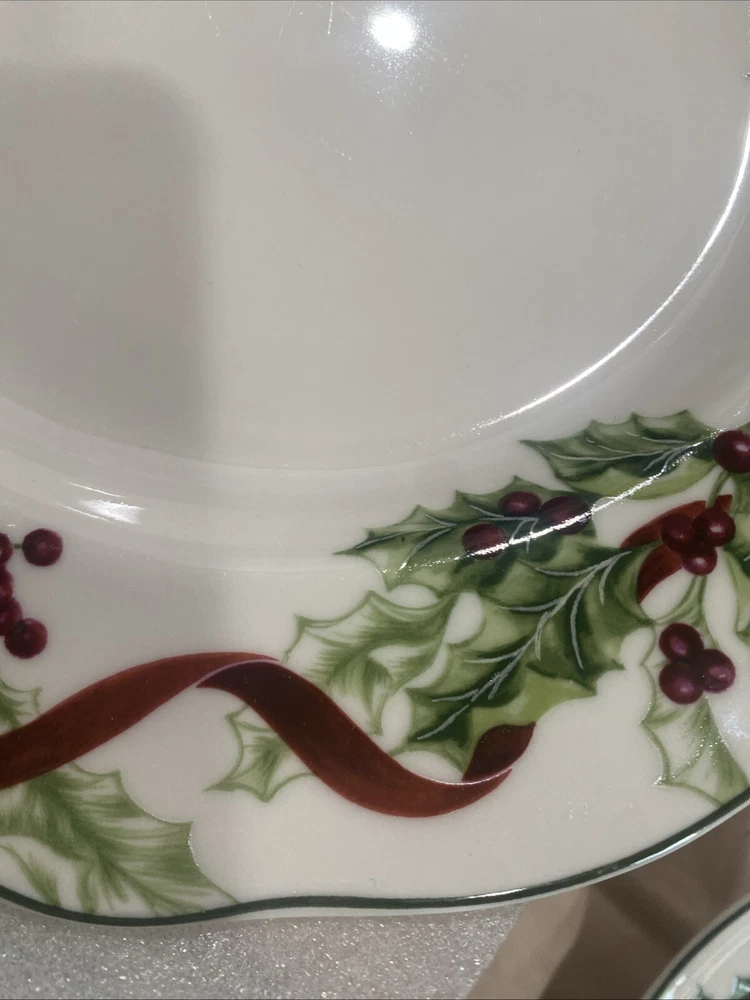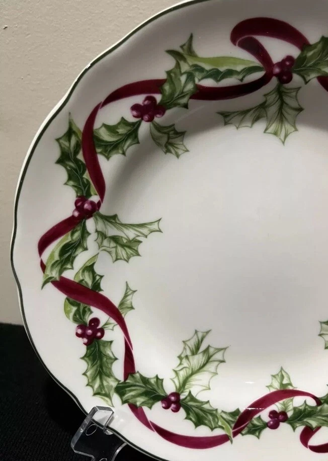 Add a touch of winter elegance to your dinner table with this beautiful Charter Club Winter Garden dinner plate. The plate features a Holly ribbon and berries design, perfect for a festive winter occasion. Made of high-quality ceramic material, this round plate has a glossy finish and is decorated with berries pattern. This original and vintage plate from 1998 is an art pottery production technique, with a printed backstamp. It is a contemporary style, decorative plate that is perfect for Christmas. The plate is from Indonesia and is a part of the Winter Garden product line. This plate is sure to impress your guests and make your dinner table look stunning.