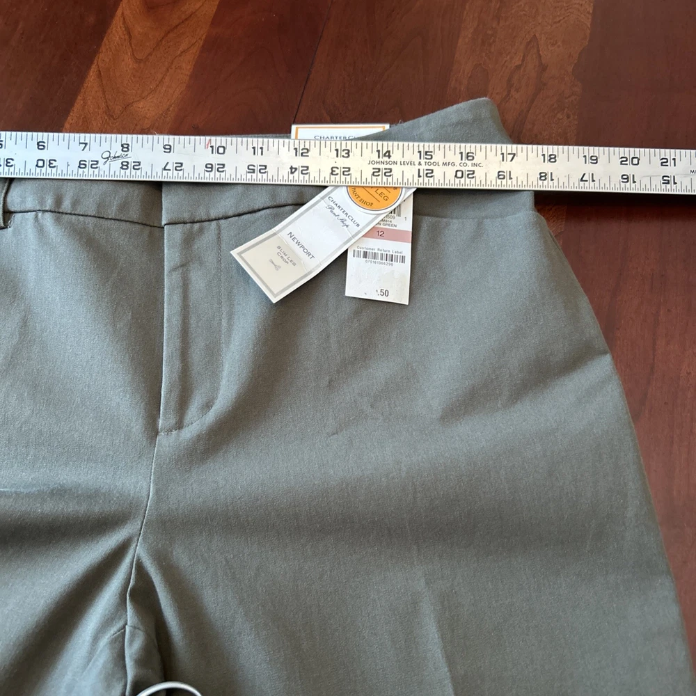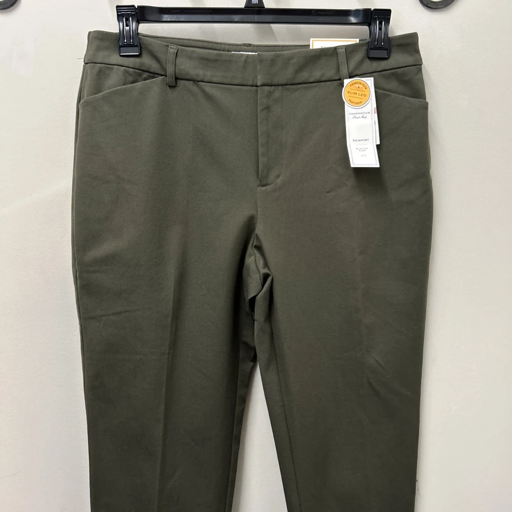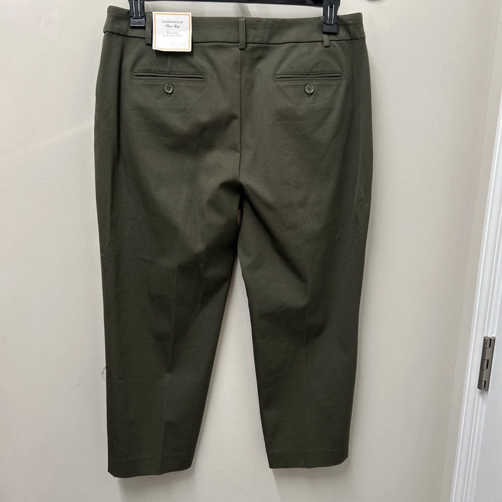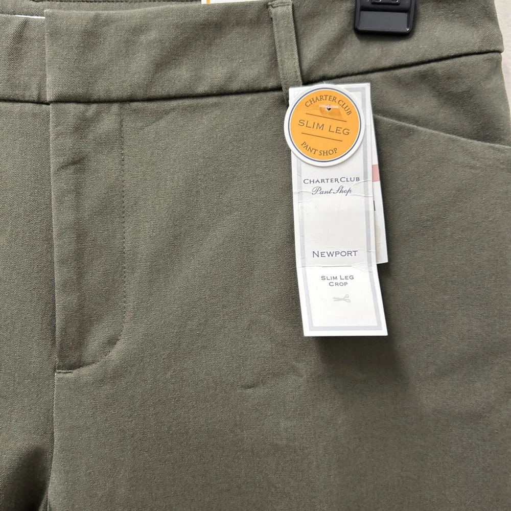Charter Club Womens Crop Pants 12 Olive Newport Slim Leg Stretch NWT Elevate your wardrobe with the Charter Club Women's Crop Pants, a perfect blend of style and comfort for the modern woman. These olive green pants, in size 12, feature a high-rise waist ensuring a flattering fit, and a sleek slim leg design that complements your silhouette. Made from a breathable blend of 57% cotton, 37% rayon, and 6% spandex, these pants promise all-day comfort and a touch of stretch for ease of movement. Designed with practicality in mind, these pants come with convenient features such as a zip closure, slash pockets, and a flat front. The cropped length makes them ideal for versatile styling, whether you're out for a casual brunch or dressing up for a evening event. With the added bonus of being machine washable, these pants are as easy to care for as they are to wear.