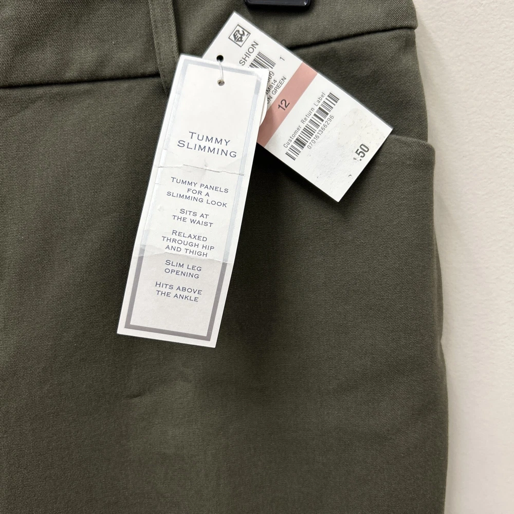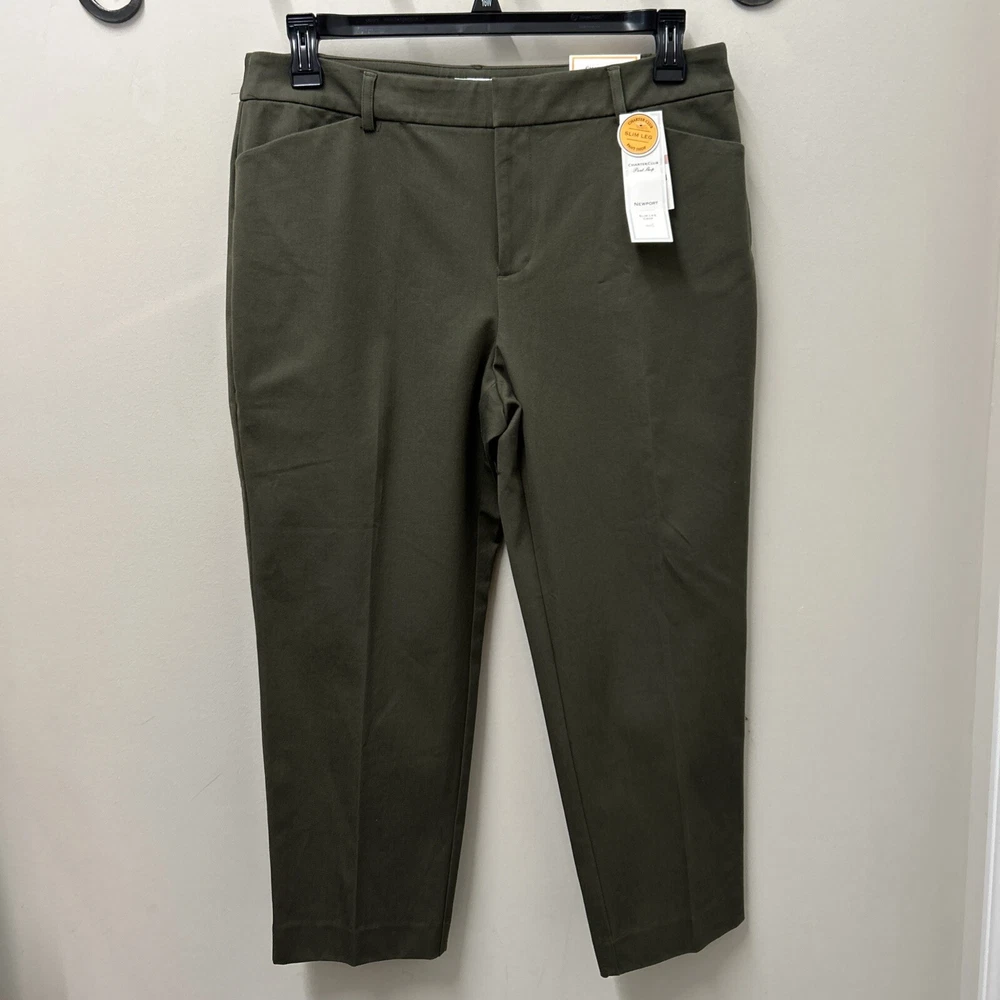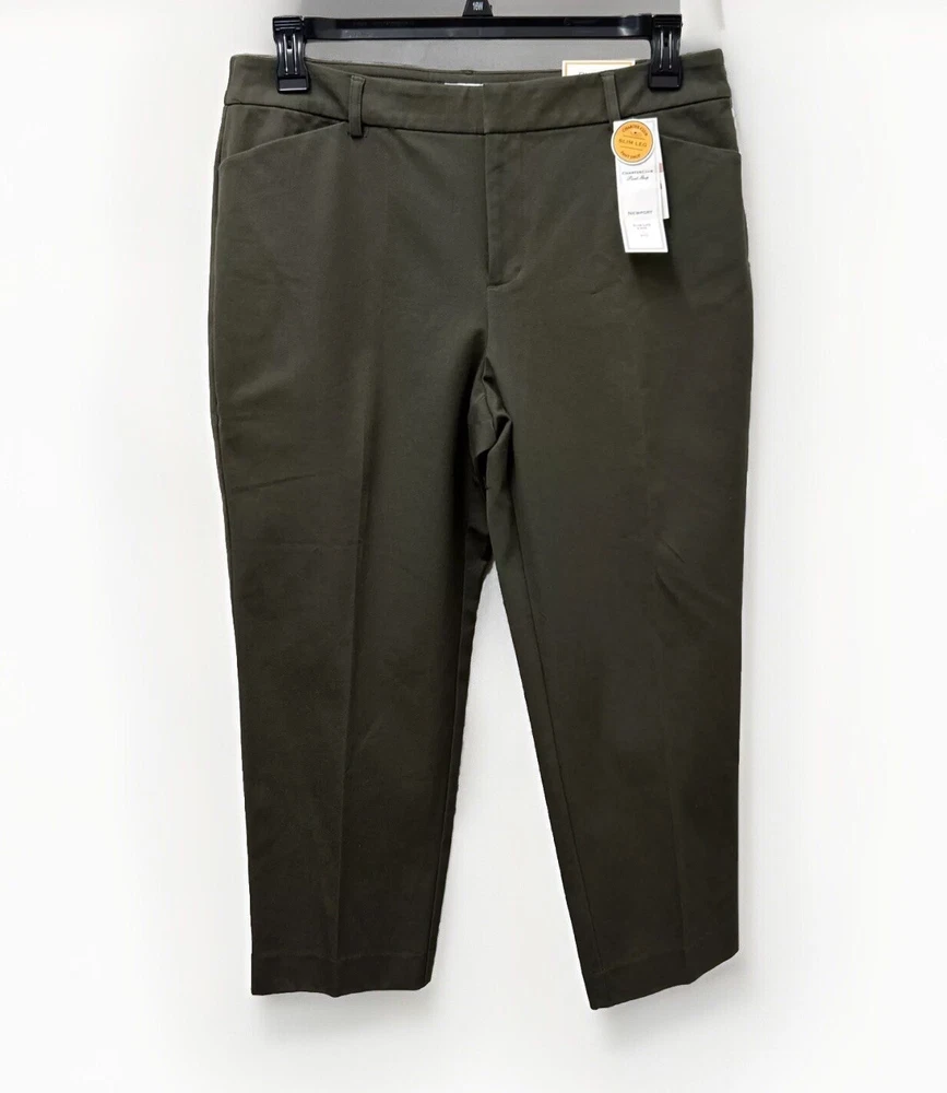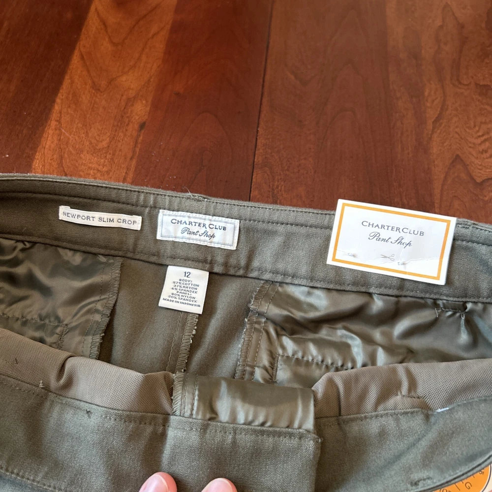 Charter Club Womens Crop Pants 12 Olive Newport Slim Leg Stretch NWT Elevate your wardrobe with the Charter Club Women's Crop Pants, a perfect blend of style and comfort for the modern woman. These olive green pants, in size 12, feature a high-rise waist ensuring a flattering fit, and a sleek slim leg design that complements your silhouette. Made from a breathable blend of 57% cotton, 37% rayon, and 6% spandex, these pants promise all-day comfort and a touch of stretch for ease of movement. Designed with practicality in mind, these pants come with convenient features such as a zip closure, slash pockets, and a flat front. The cropped length makes them ideal for versatile styling, whether you're out for a casual brunch or dressing up for a evening event. With the added bonus of being machine washable, these pants are as easy to care for as they are to wear.