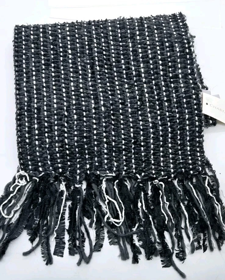 Charter Club Women's Scarf Black Grey White Glitter Flicks Fringed NWT Timeless and Stylish Design Makes a Great Gift! New with Tags - Retail $42.00 Scarf Measures Approximately 10" x 72"; Fringe at Ends 76% Acrylic, 14% Poly, 9 % Rayon 1% Other Fiber; machine wash cold Disclaimer: Product color may vary slightly due to your monitor settings.