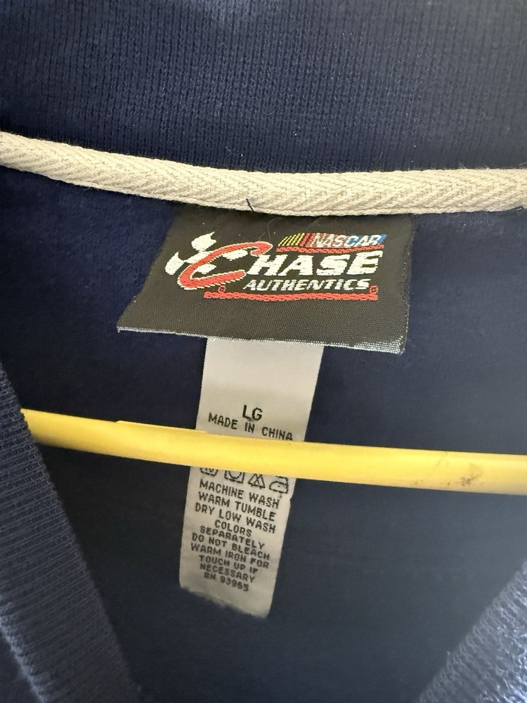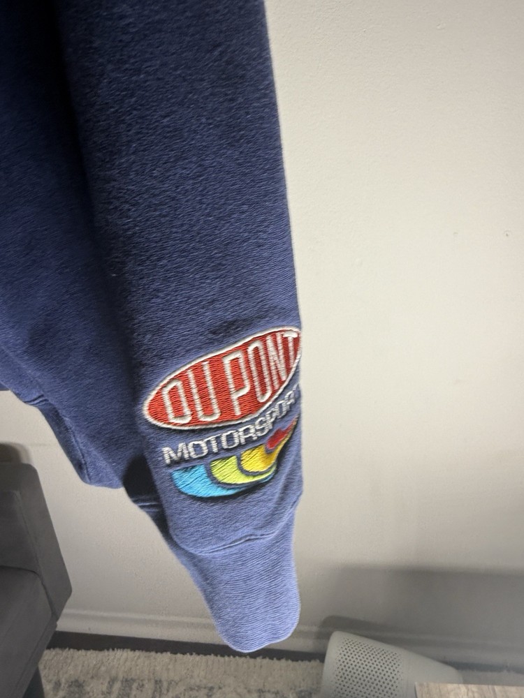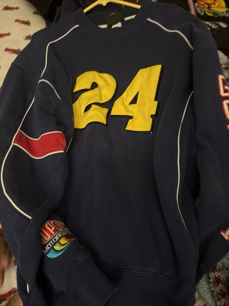 Gear up for race day with the Chase Authentics Jeff Gordon 24 NASCAR Dupont Racing Crewneck Sweatshirt. This blue pullover is a must-have for any racing enthusiast, featuring a comfortable crew neck and long sleeves perfect for those chilly days at the track. Crafted from a cozy cotton blend with a touch of fleece, it's designed for both warmth and breathability. With its heavyweight fabric, this sweatshirt is built to last through every victory lap of fandom. Machine washable for easy care, it embodies the spirit of the '90s sports era. Whether you're watching from the stands or from the comfort of your own home, this size large sweatshirt is a stylish nod to the legendary Jeff Gordon and his iconic racing career. Heavy!! Fits nicely, if any questions message me! No holes or rips