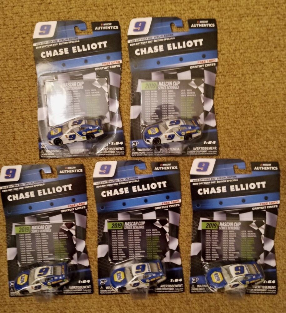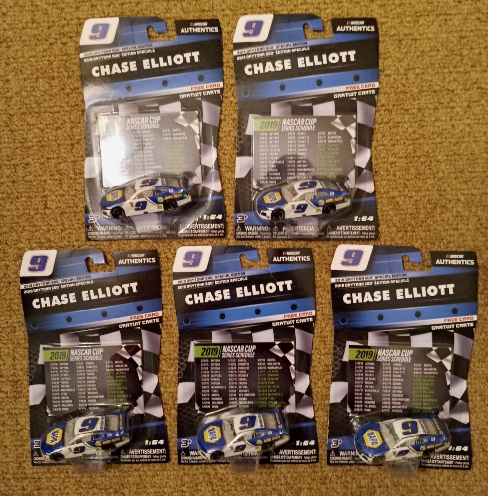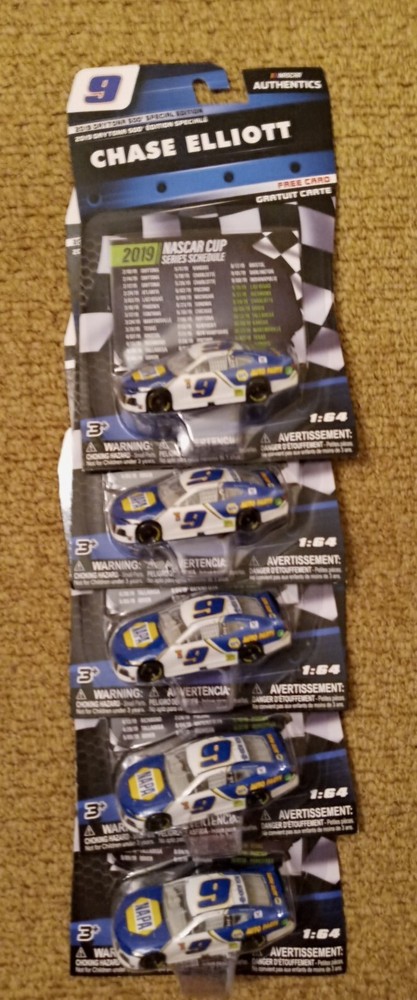 Explore the high-octane world of NASCAR with this lot of five Chase Elliott 2019 Daytona 500 Special Edition 1:64 scale diecast car. From Lionel, these collectibles captures the essence of speed and competition, featuring meticulous details that mirror Elliott's iconic Chevrolet racecar. Ideal for fans of the sport or diecast collectors, this piece celebrates the thrills of the Daytona race and is a must-have for those who cherish the legacy of NASCAR racing. Chase Elliott Five-car lot, showcases the sleek design and vibrant colors that honor the NASCAR Authentics series. With its place in the Cars character family, it holds a special appeal for enthusiasts of all ages. Whether displayed on a shelf or used in play, this diecast model brings a piece of NASCAR's history right into your collection.New on card condition thanks for looking.