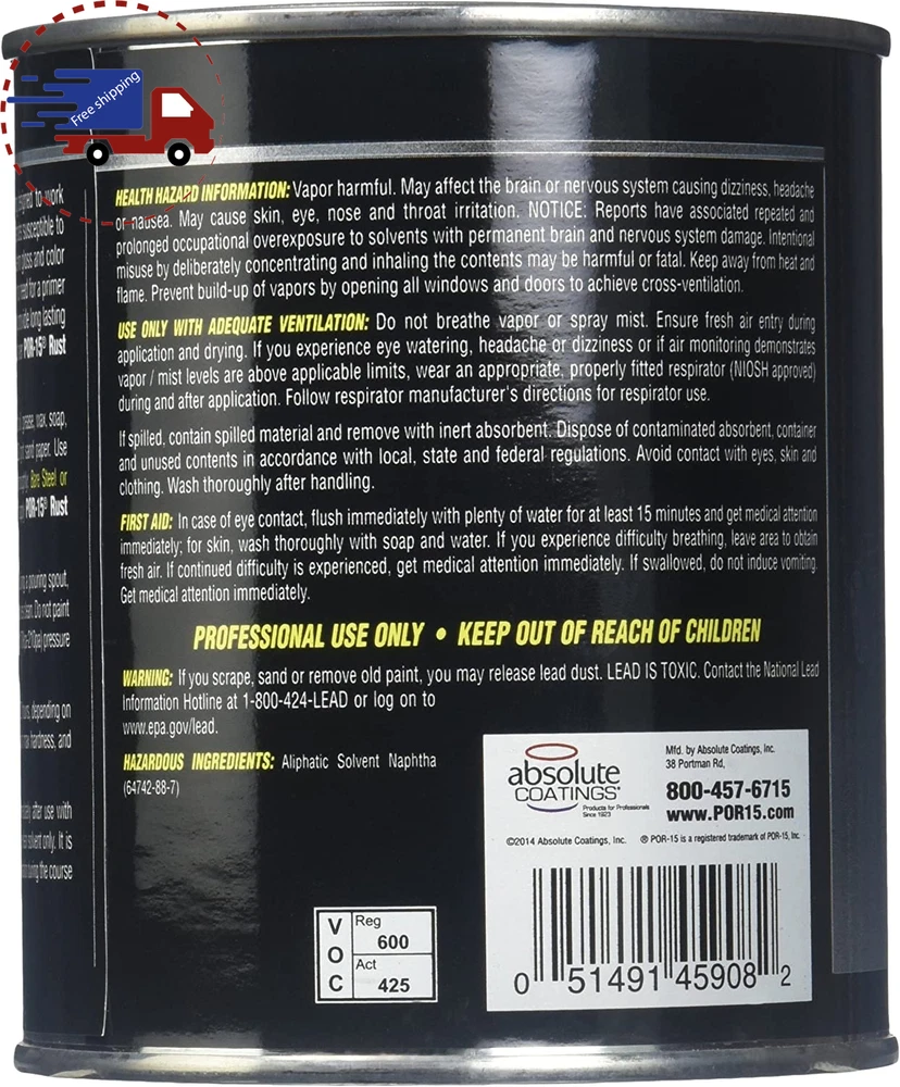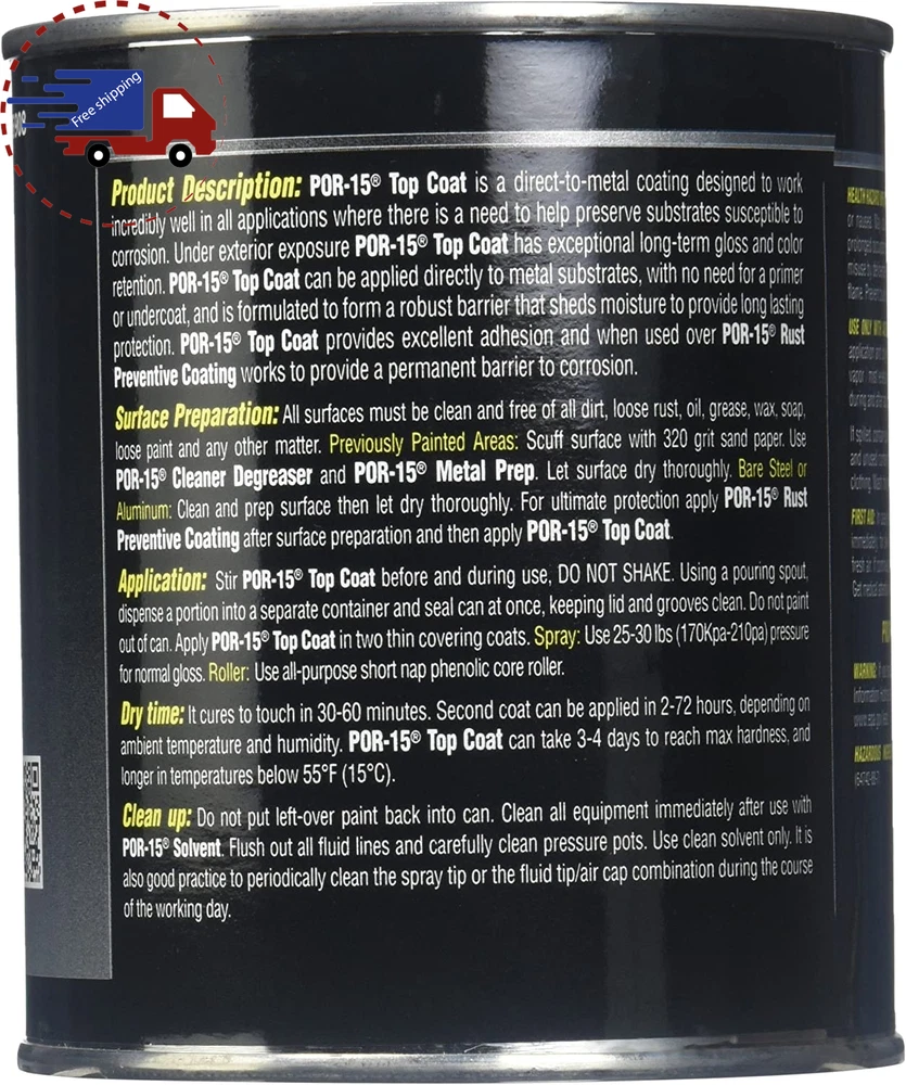 Menu Other Items Feedbacks About Us Contact Us Add To Favorites Chassis Black Top Coat Paint -16 Fl Oz - Direct to Metal Paint ✅ WHY CHOOSE POR-15 CHASSIS BLACK TOP COAT PAINT? – POR-15 is an industry standard for high performance protection against corrosion and rust. Our direct-to- metal coating is essential in all applications where there is a need to help preserve substrates susceptible to corrosion. POR-15 Top Coat provides excellent adhesion and best when used over POR-15 Rust Preventive Coating, works to provide a permanent barrier. ✅ LONG LASTING PROTECTION - POR-15 Top coat has exceptional long-term sheen and color retention, with a hammer tough finish that won’t crack or peel. It can be applied directly to metal substrates or previously painted surfaces without need for primer or undercoat. Formulated to form a robust barrier that sheds moisture. ✅ APPLICATION - All surfaces must be clean and free of all dirt, loose rust, oil, grease, wax, soap, loose paint & any other matter. Use 25-30 lbs (170Kpa-210pa) pressure for normal gloss. It dries to touch in 30-60 minutes. POR-15 Top Coat can take 3-4 days to reach maximum hardness, and longer in temperatures below 55°F (15°C). ✅ WHEN DO I NEED THIS? - POR-15 Top Coat is essential for that extra layer of durability and provides optimum protection against UV light that won’t fade over long term exposure. ✅ OUR SATISFACTION COMMITMENT – At POR-15 we strive to bring the ultimate in rust prevention. Known for the unbeatable 3-step stop rust system, POR-15 is trusted by DIY & Professionals. We are committed to innovation, quality control, and excellent customer service. POR-15 Chassis Black Top Coat is a direct-to-metal (DTM) paint designed to work incredibly well in all applications where there is a need to help preserve substrates susceptible to corrosion. Under exterior exposure POR-15 Top Coat has exceptional long-term sheen and colour retention. POR-15 Top Coat can be applied directly to cleaned bare metal substrates or previously painted surfaces, with no need for a primer or undercoat, and is formulated to form a robust barrier that sheds moisture to provide long-lasting protection. POR-15 Top Coat provides excellent adhesion and when used over POR-15 Rust Preventive Coating, works to provide a permanent barrier to corrosion. Item Specification Style Liquid Color Chassis Black Special Feature Direct to Metal, U.V. Resistant Age Range (Description) Adult Surface Recommendation Metal Cover Included 1 Can Finish Type Gloss Specific Uses For Product Exterior Paint Type Oil Size 16 Fl Oz (Pack of 1) EASY TO USE EASY TO USE Fast Shipping Free Shipping CUSTOMER SERVICE 24/7 WE SOLVE ANY PROBLEM limted quantity in STOCK: limted quantity in STOCK: Less Than 24 Hours Responce Time Dimensions Shipping Additional Info Product Dimensions: 3.25 inches x 3.25 inches x 3.25 inches. Weight: 1.0 lb Fast And Fast shipping is very important for us. Our standard shipping service is FREE. Your order will be shipped within 1-3 business days upon full payment received. Most items are delivered within 3-5 business days, however, please allow 3-10 business days. We are shipping only to USA. We only ship to the confirmed Paypal address. We reserve the right to cancel any order for any reason at any time. We are not responsible for undeliverable addresses. All of our items, unless otherwise stated, will only run on 120 volts. Please check to make sure your country complies with these specifications. If you have a problem or question regarding your transaction please contact us before leaving any type of feedback. We will work with you to resolve any problem you may have.