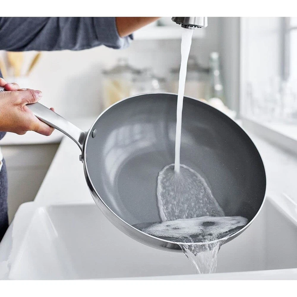 ’s Thermolon healthy ceramic nonstick coating is free of PFAS, PFOA, lead, and cadmium, so it will never release toxic fumes, even if it’s accidentally overheated Metal utensil safe, this collection's diamond-reinforced coating is incredibly durable 3-Ply Stainless Steel: High-quality stainless layers with an aluminum core for better performance, efficiency, and durability Oven and broiler safe up to 600°F Dishwasher safe for easy cleanup Matte stainless steel handle features a riveted, ergonomic design for a secure and comfortable grip Suitable for all stovetops, including induction Limited lifetime warranty