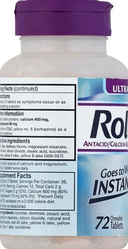 For Rolaids ultimate heartburn , Rolaids Ultra Strength Antacid Chewable deliver. Rolaids Ultra Strength antacid neutralizes 15% more stomach acid than Tums Ultra Strength.* Each antacid neutralizes more than 100 times its own weight in stomach acid, so it goes to work instantly.* Rolaids Ultra Strength Chewable come in an assorted fruit flavor. Keep a bottle of Ultra Strength Rolaids in your medicine cabinet, in the car or in your computer bag to have heartburn always on hand. *Acid neutralization does not correlate with symptom CONTAINS: (1) 72-count bottle of Rolaids Ultra Strength Antacid Chewable , Assorted Fruit flavors OLAIDS ULTIMATE ACID-NEUTRALIZING HEARTBURN : Rolaids Ultra Strength antacid neutralize more than 100 times their own weight in stomach acid* GOES TO WORK INSTANTLY: Chewable antacid with calcium carbonate and magnesium start to work immediately to help relieve heartburn, acid indigestion, and sour stomach CONVENIENT: Chew 2-3 as symptoms occur or as directed by a doctor; do not take more than 7 in 24 hours; do not use the maximum dosage for more than 2 weeks ASSORTED FRUIT FLAVOR: This heartburn comes in an assorted fruit flavor