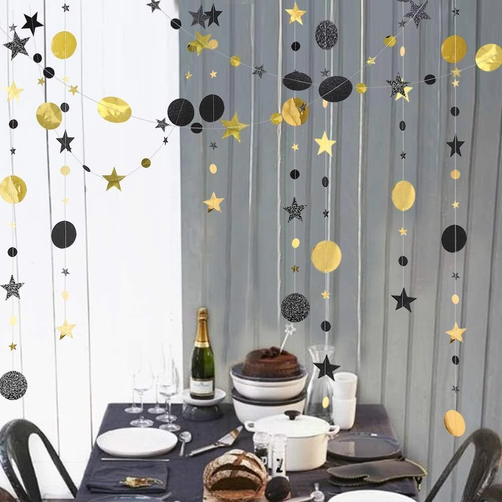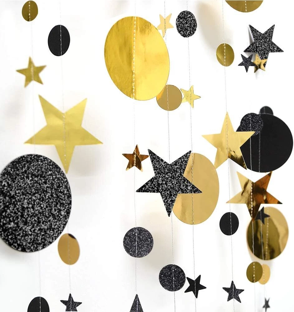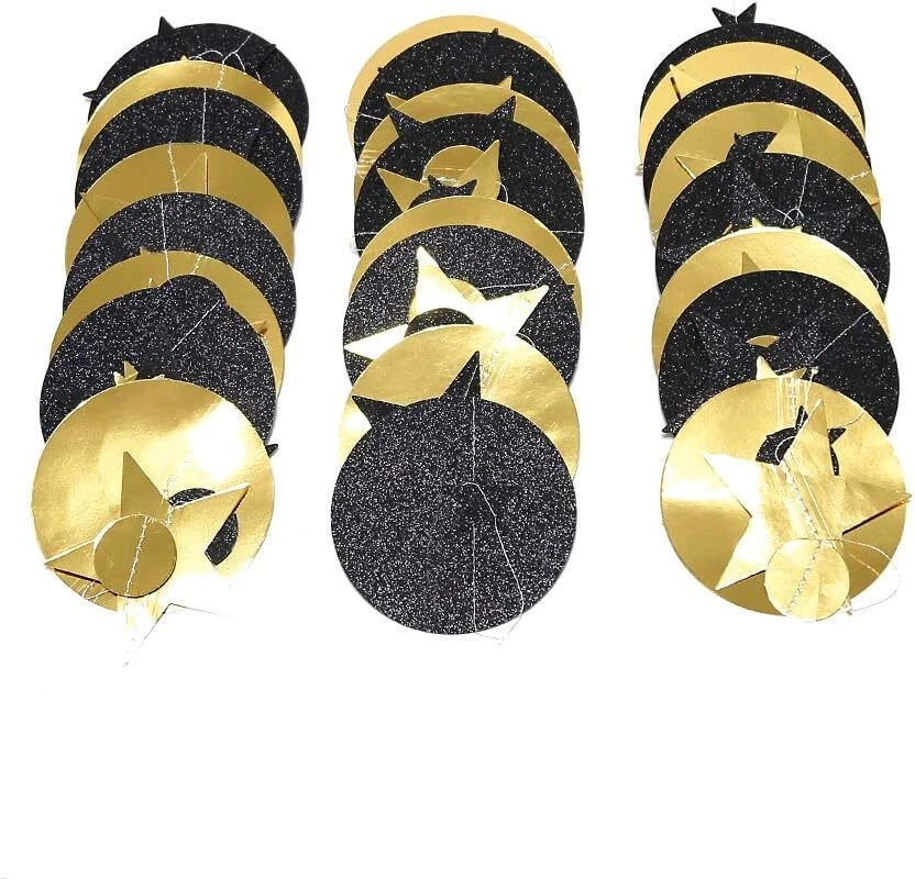 Cheerland Black Gold Party Decorations Moon Star Garland Hanging Product Details Brand: Cheerland Color: Gold Black Material: Paper Item Length: 468 Inches Is Artificial Garland: No ·Package Includes: 3 strings of 13 feet glittering and shiny black gold star and moon circle garlands. Totally 39 ft. The biggest paper circle is 3.5 inches in diameter. ·Black Gold Party Decorations: The black and gold stars and moons streamer made of glitter and shining card paper sway in the breeze and reflect light from all angles. These garlands are gorgeous party decorations to create a elegant and classy atmosphere at home or any festive event. ·Brilliant Decor for Most Occasions: These garlands are perfect decorations for most parties and celebrations such as wedding, engagement, bachelorette, bridal shower, baby shower, christening, birthday/Bday, sweet 16, graduation, retirement, Christmas and NYE New Year Eve, space themed parties, galaxy themed, proms, homecoming, fantasy themed, halloween, masquerade, galactic themed party, star wars party. They are also good ornaments for Islamic celebrations for Ramadan, Hari Raya and EID. Easy to Use: NO DIY needed. Unravel the strings with care to avoid tangling. Just hang them or stick them on wall, window, furniture, from ceiling or as background, backdrop of photo booth. Easy to remove and store for future reuse. Cheerland is an established brand of party decorations & supplies. We excel at creating novel designs and manufacturing quality products to suit your decoration needs. Come visit our shop often, you will surely find some interesting add-ons for your home and parties.