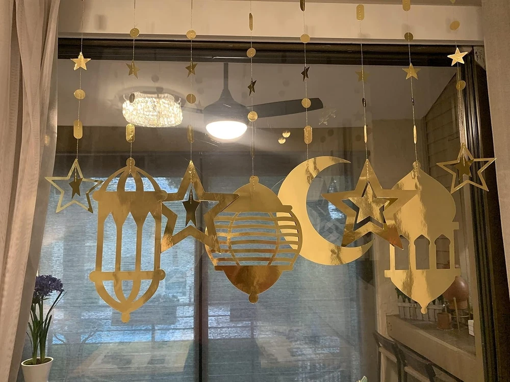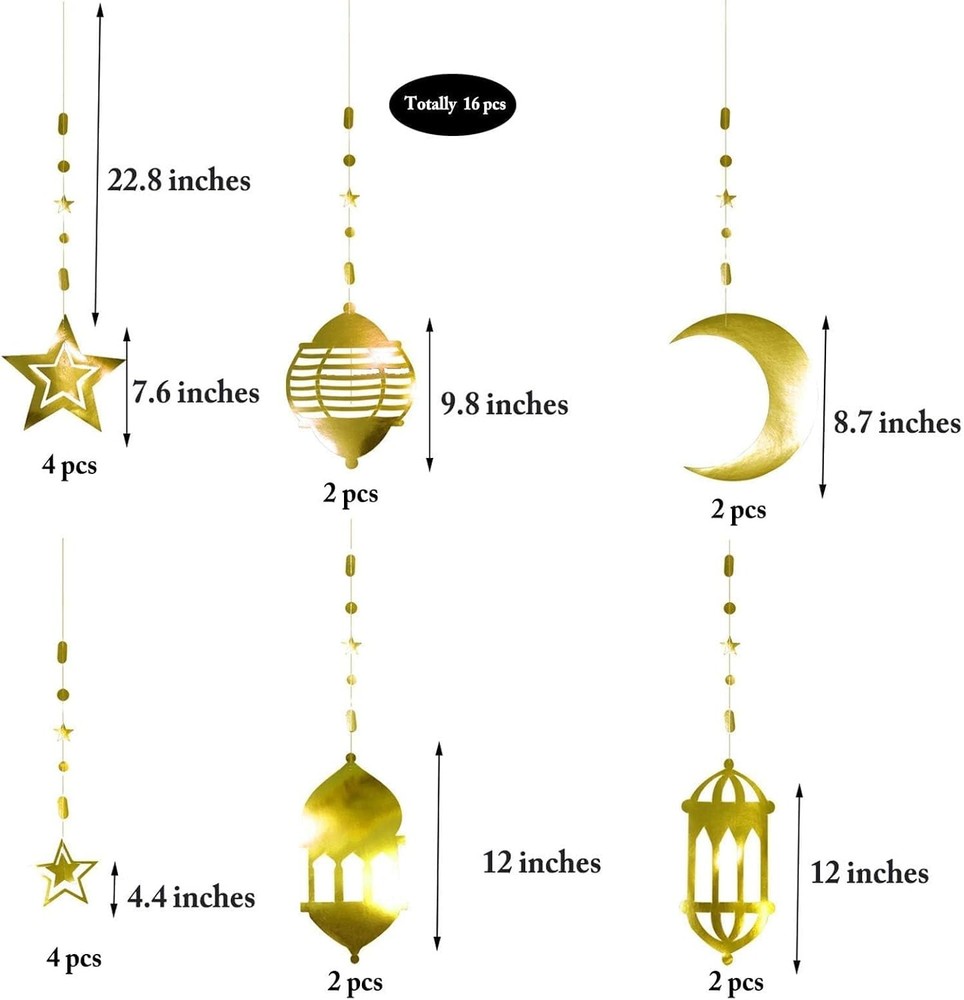 Cheerland Gold Star Moon Lantern Garland Arabian Nights 16 Piece Set, Product Details Size: 16 Piece Set Shape: Star, Moon Product Dimensions: 1.3 x 7.8 x 11.69 inches Item Weight: 3.52 ounces Item model number: TZ-KZJ-2P-G Batteries required: No Brand: Cheerland Color: Gold Material: Paper Item Length: 10 Feet Item Weight: 0.1 Kilograms Package Includes: 16-piece gold garlands, featuring crescent moons, stars, and lanterns suspended from strands of circles and stars. Banner heights range from 4.4 to 12 inches, Celebration & Festivities: Perfect for Ramadan Mubarak, Eid parties, and Islamic celebrations, this Ramadan banner enhances Arabian night themes, Islamic backdrops, celestial decor, and moon phase garland arrangements. Whether you're decorating for a happy Ramadan gathering, Eid Mubarak celebration, or even a witchy decor aesthetic, these gold star garlands add a luxurious touch to any event Guideline: Effortlessly add some festive spirit to your event space—They are pre-strung so no DIY needed! Simply hang these moon garlands on walls, windows, mantels, doorways, or ceilings for a striking Ramadan decoration home piece. Whether used as a star garland, star streamer, or gothic decor accent, these decorations are versatile for Eid festivities, Halloween decoration, goth room decor, and celestial parties Quality: Crafted from premium card paper with vibrant, long-lasting colors and sturdy strings, these reusable decorations are eco-friendly and durable. Whether used as a gold star garland, moon decor, or iridescent star moon garland, they maintain their brilliance over multiple occasions, making them a sustainable choice for Ramadan decoration, moon star birthday decorations, and eclipse decorations Exclusivity: This gold crescent and star garland set adds sophistication to Ramadan, Eid Mubarak celebrations, and celestial decor themes. Whether displayed as a Ramadan lantern banner, moon phase garland, or golden decor accent, these moon and star decorations create a timeless and elegant atmosphere