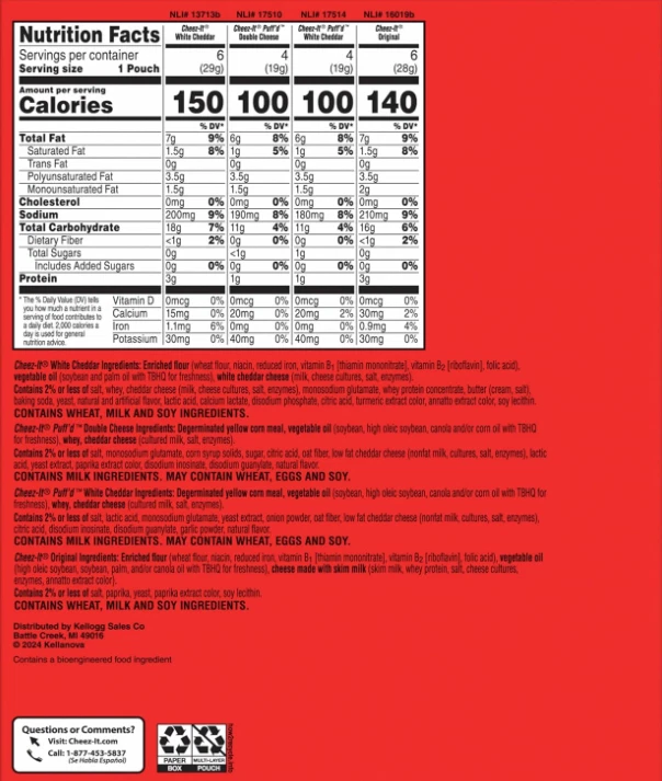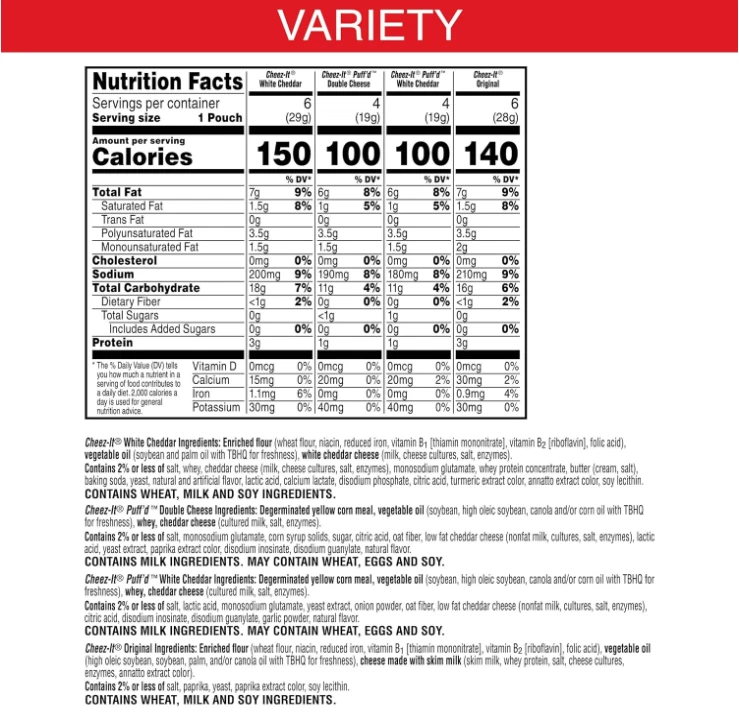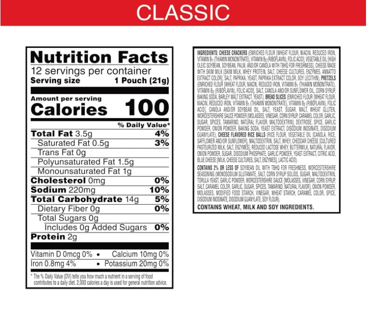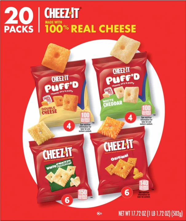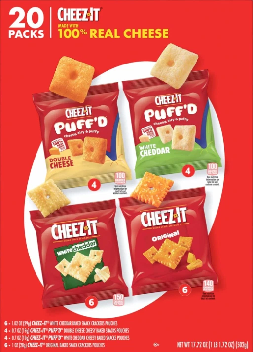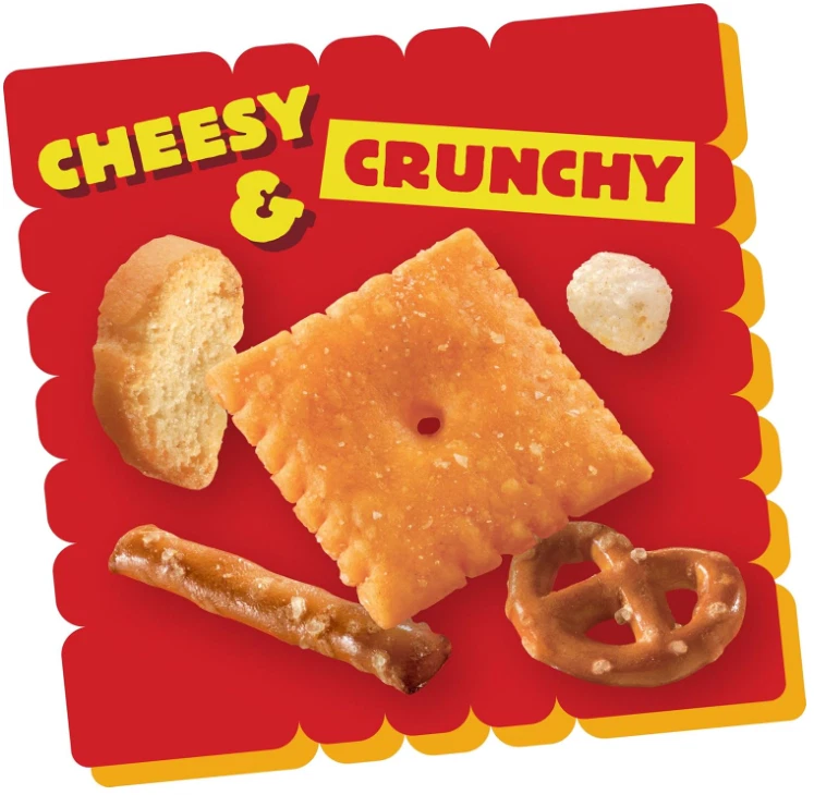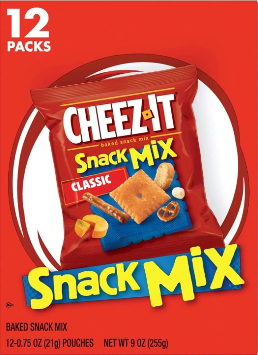 Cheez-It Snack Mix, Lunch Snacks, Office and Kids Snacks, Classic, 9oz Box (12 Packs) About this item : · A perfectly seasoned snack mix of crackers made with real cheese, salty pretzels, mini toasted bread slices, savory wheat squares, and cheese flavored rice balls · Our irresistible baked snack mix is great for sharing and makes a delicious anytime snack that pleases both kids and adults · Made with 100% real cheese aged for a bold taste; Contains wheat, milk, and soy ingredients; Kosher dairy · Convenient caddy box for grab-and-go snacking; Individually wrapped; Stock your home pantry, store for treats at school, in lunchboxes or tote bags for anytime snacking · Includes 1, 9-ounce caddy box of 12, 0.75-ounce pouches of ready-to-eat snack mix; Packaged for freshness and great taste Product Description: Satisfy your snack time cravings with a delicious handful of Cheez-It Snack Mix Classic. This snack mix features a tasty combination of baked snack crackers made with 100% real cheese, salty pretzels, mini toasted bread slices, savory wheat squares, and cheese flavored rice puffs that have been baked to crispy, crunchy perfection. This snack mix is perfectly sized for on-the-go snacking, as a flavorful addition to a packed lunch, or even just a quick bite around the house. Toss a pouch in your tote for a long commute, bring some snack mix in the car for a road trip, or stash them in your desk at the office for convenience. You can spice up everyday, out-of-the-home activities like field trips, camping, hiking, trips to the park, picnics, outdoor concerts, errands, and more by bringing along our Classic snack mix. No matter where you enjoy it - you'll love the epically satisfying mix of flavors in every handful of Cheez-It Snack Mix Classic.