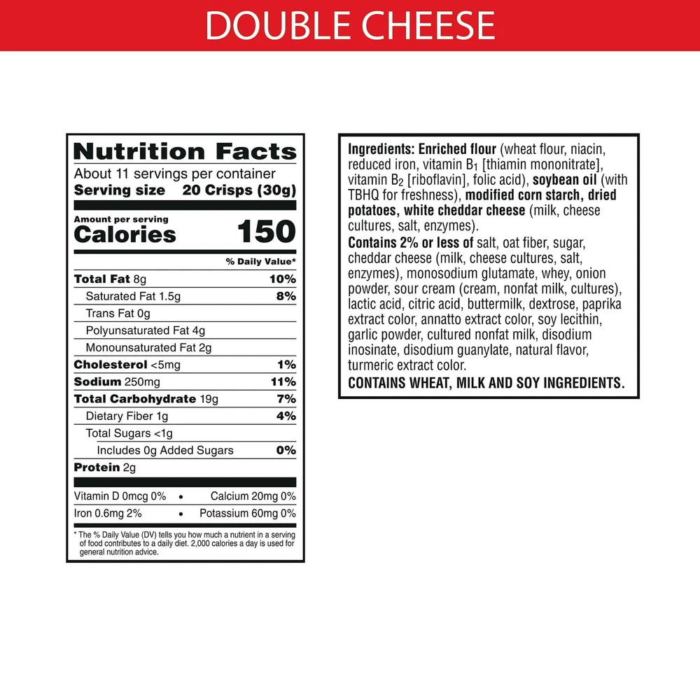 Satisfy your cravings with Cheez-It Snap'd Double Cheese Cracker Chips, offering a perfect blend of crunchy and cheesy. Each 12 oz bag is filled with thin crisps that are ideal for satisfying your hunger between meals or adding a savory touch to your favorite beverages. The classic cheese flavor ensures a delicious experience with every bite. Crafted in the United States, these snacks are a pantry staple for any snack lover. With a serving size of 100 grams, it's easy to enjoy a guilt-free snack that's both satisfying and delicious. Whether you're looking for a quick snack or something to share with friends, Cheez-It Snap'd chips are the answer.