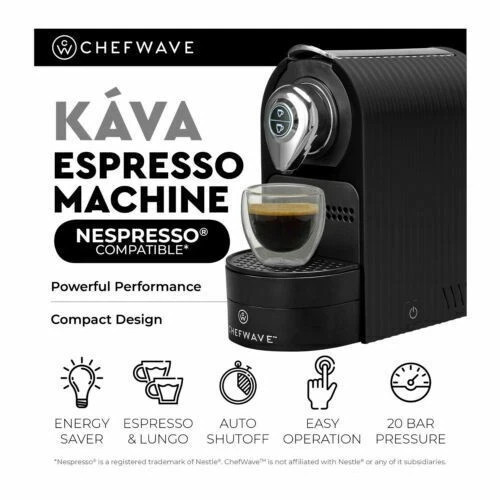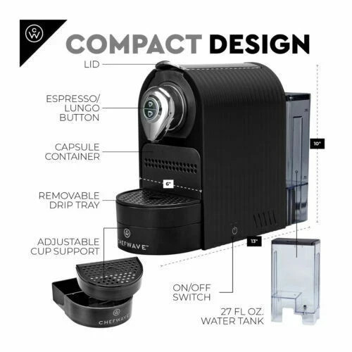 The ChefWave Nespresso-Compatible Espresso Maker with Capsule Rack in Black is a stylish and efficient espresso machine perfect for home use. With a 27 fl oz water tank capacity, this wall plug-in machine can produce delicious espresso drinks in just 30-35 seconds at 20 bar pressure. It is compatible with Nespresso capsules and includes features such as a built-in water filter and drip tray for easy maintenance. The sleek black design and compact size make it a great addition to any kitchen, while its 1400 W power ensures consistent and high-quality coffee brewing.