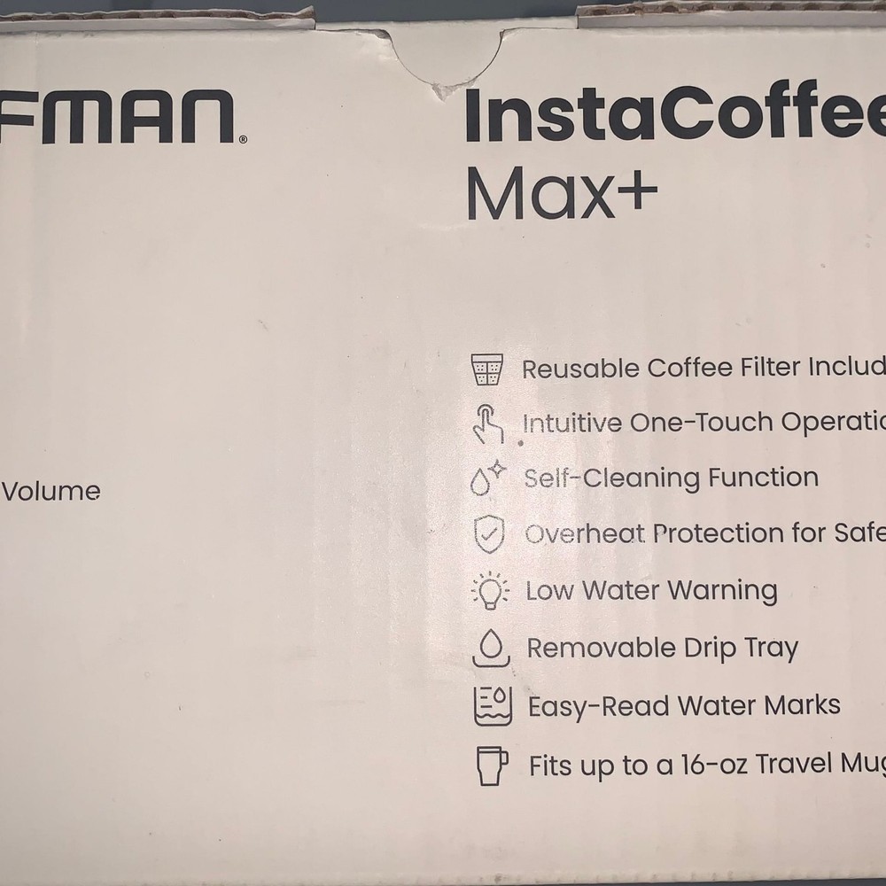 Brand new, never used Chefman Instacoffee Max+ Single Serve Coffee Maker. Open box only. Comes with all original packaging. Brew your favorite coffee easily at home!