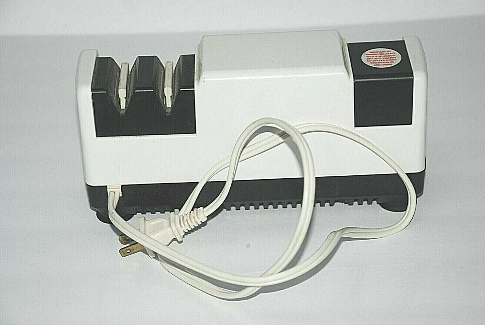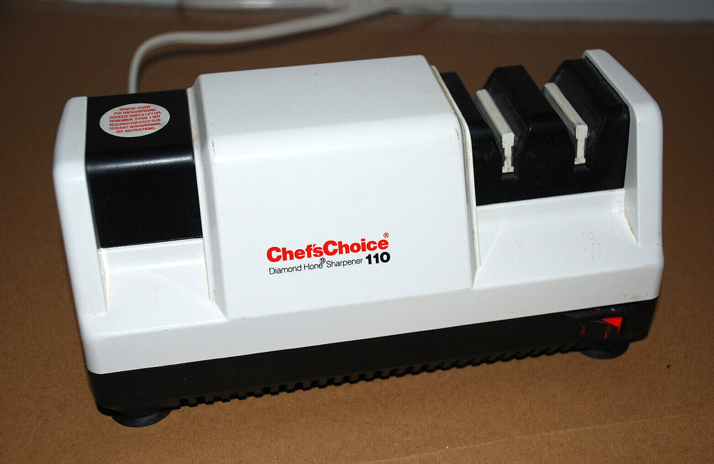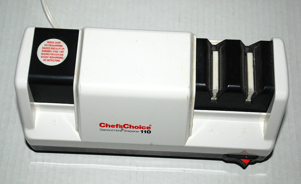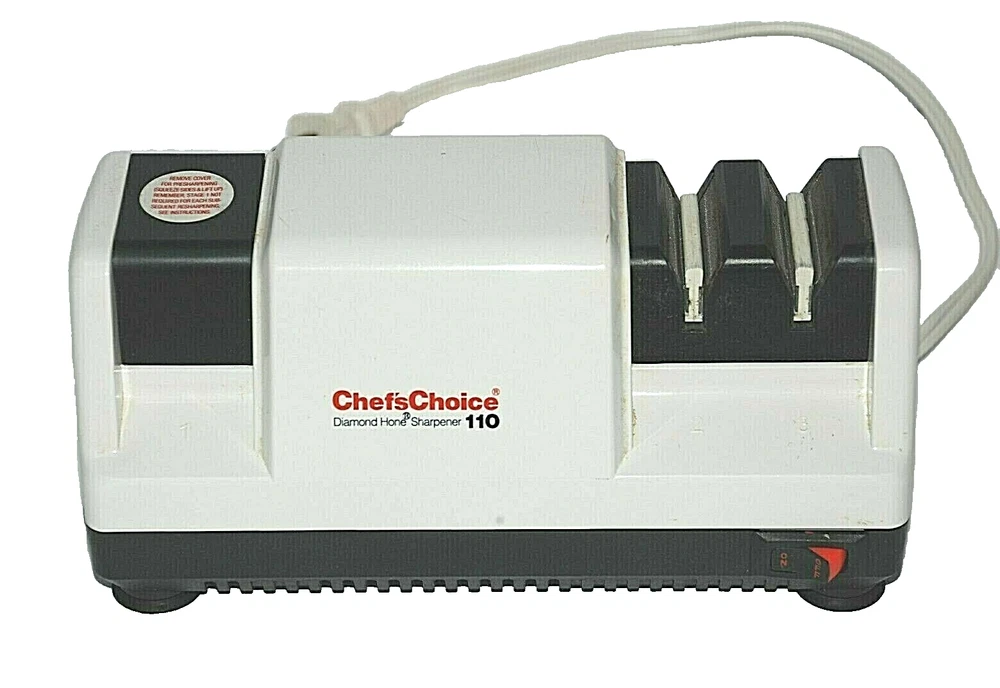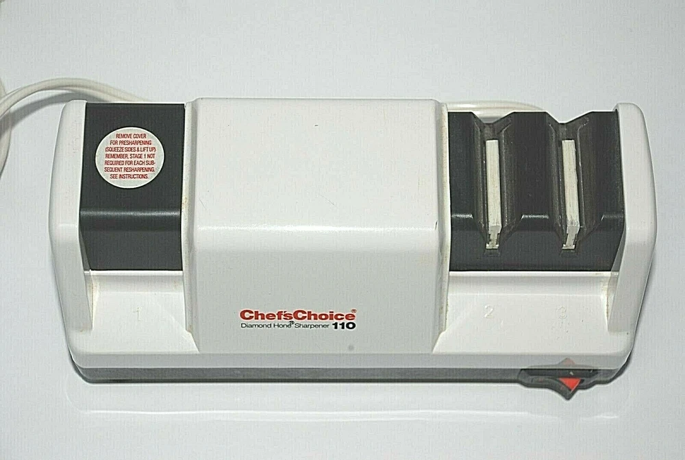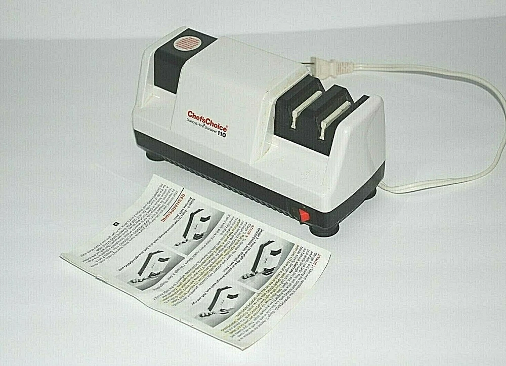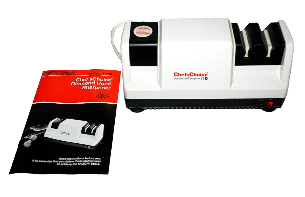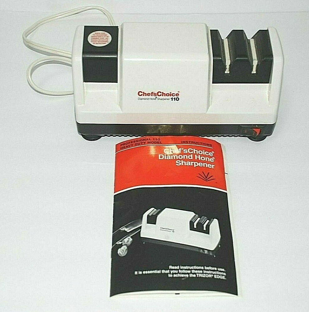 Chefs Choice Professional Electric Knife Sharpener Diamond Hone Model 110 Manual. Heavy Duty. Made in the USA. The Chef'sChoice Professional Electric Knife Sharpener Diamond Hone Model 110 is a high-quality, precision sharpening tool designed to restore and maintain the sharpness of your kitchen knives. Featuring a durable and reliable diamond abrasive system, this electric sharpener ensures your blades are honed to perfection with ease. It utilizes a 3-stage sharpening process, which includes coarse, medium, and fine options, making it suitable for a wide range of knives, from serrated to straight-edge. The sharpener's advanced motor and diamond-coated honing wheels deliver superior performance, ensuring a razor-sharp edge every time. Perfect for both home chefs and professionals, the Chef'sChoice Model 110 is an essential tool for anyone who values quality and efficiency in the kitchen. With its compact, sturdy design and user-friendly operation, it's an ideal addition to any kitchen, offering long-lasting performance and precision for years to come. It wasn't used all the time so it's stayed in nice shape. Comes from a smoke free home. It does not come with the original box.