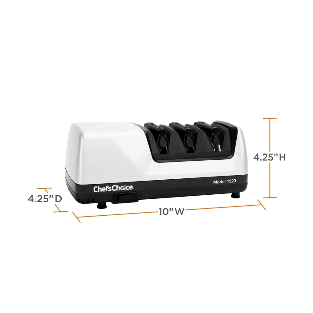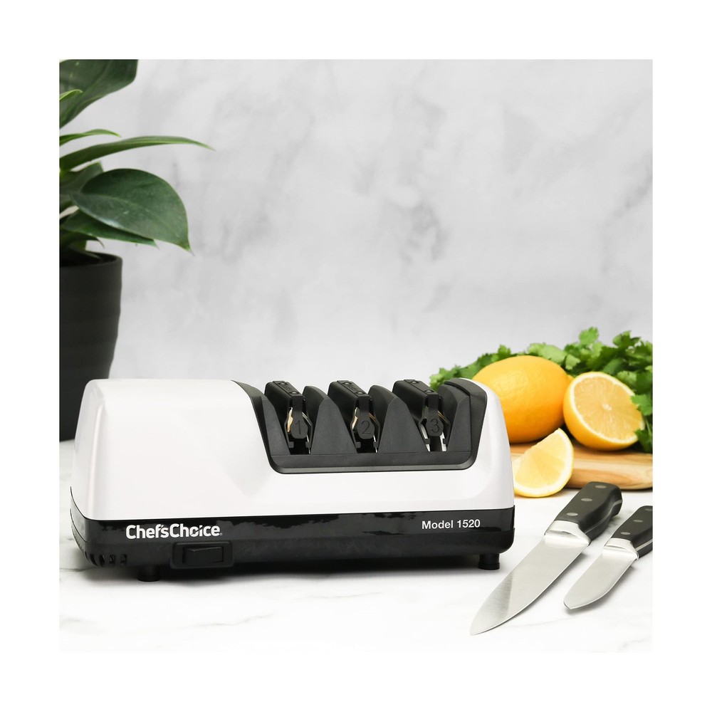 Chef’s Choice Professional Electric Knife Sharpeners for 15- and 20-Degree Straight-Edge and Serrated Knives with Diamond Abrasives & Precision Angle Control, 3-Stage, White Description This compact 3-stage electric knife sharpener for kitchen knives comes equipped with 100-percent diamond abrasives that sharpen edges faster and easier. Ideal for all 15- and 20-degree knives, including both straight-edge and serrated knives, this sharpener improves cutting performance by creating 2 distinct facets set at different angles to form a longer lasting, arch-shaped edge. The first stage sharpens 15-degree knives, while the second stage sharpens 20-degree knives. In the final stage, patented stropping disks apply an unparalleled polished finish to both 15-degree and 20-degree knives. The Chef’sChoice 1520 quickly and easily sharpens virtually all quality cutlery, including American, European, and Asian-style household knives, fine-edge or serrated blades, Santoku and traditional Japanese-style single-bevel edges, as well as sports knives and pocket knives. Advanced patented technology restores and recreates 20-degree edges for traditional European- and American-style knives and 15-degree edges for Asian-style knives and contemporary European/American-style knives. First-time sharpening takes approximately 1 minute. Resharpening takes approximately 10 seconds. Precision angle guides ensure accurate sharpening throughout the entire blade length and eliminate any guesswork. Features: ANGLESELECT Applies a traditional 20 degree edge or a finer 15 degree edge for precision slicing 100% diamond abrasives for sharpening and honing DIZOR ENGINEERED 2 distinct facets set at different angles that form a longer lasting, arch-shaped edge PRECISION ANGLE GUIDES - Ensures accurate sharpening throughout the entire edge and eliminates any guesswork SHARPENS MOST KNIVES Sharpens straight edge and serrated knives Product Details: Material: Diamond Brand: Chef's Choice Color: White Product Dimensions: 10"L x 4.25"W x 4.25"H Item Weight: 4.15 Pounds Grit Type: Fine Number of Items: 1 Manufacturer: Chef'sChoice Global Trade Identification Number: 07 UPC Material: Diamond Brand: Chef's Choice Color: White Product Dimensions: 10"L x 4.25"W x 4.25"H Item Weight: 4.15 Pounds Grit Type: Fine Number of Items: 1 Manufacturer: Chef'sChoice Global Trade Identification Number: 07 UPC: 729798510910 087877015207 723521732440 Item Weight: 4.15 pounds Department: unisex-adult Item model number: 0115200 Is Discontinued By Manufacturer: No Date First Available: May 2, 2008 Delivery We Do Not Ship Outside of the Continental US. Return Policy All items qualify for returns within 30 days of receipt. Feedback We take our reputation seriously, we buy and sell online, so we understand the value of trust. If you are unsatisfied with your order, please contact us and we will work with you to resolve it to your satisfaction.