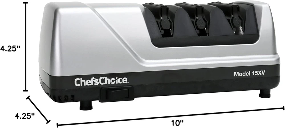 Chef’sChoice 15XV EdgeSelect Professional Electric Knife Sharpener with 100-Percent Diamond Abrasives and Precision Angle Guides for Straight Edge and Serrated Knives, 3-Stage, Gray Size: 3-stage Material Diamond Brand Chef's Choice Color Gray Product Dimensions 10"L x 4.25"W x 4.25"H Item Weight 4.2 Pounds Grit Type Fine Number of Items 1 Manufacturer Chef'sChoice Global Trade Identification Number 00087877011155 UPC 087877011155 About this item Electric Knife Sharpener CONVERT YOUR KNIVES: Ideal for converting traditional 20-degree factory edges of household knives into high performance Trizor XV 15-degree edges DIAMONDS: Advanced stropping stage and 100 percent diamond abrasives for sharpening straight edge and serrated blades EASY TO USE: Advanced, patented flexible spring guides for automatic adjustment and accurate control of the sharpening angle and feature simple on/off switch THREE STAGES: 3-Stage EdgeSelect sharpening system for optimum versatility in providing the perfect edge for each cutting task. Stages 1 and 2 are plated with 100-percent diamond abrasives to sharpen and hone the edge and stage 3 uses a patented flexible abrasive system to polish and help prolong the life of serrated knives RAZOR SHARP: The 15 Trizor XV combines the strength and durability of the Trizor edge with the flawless, ultra-sharp 15-degree XV technology. Time Required to sharpen is approximately 1 minute for first time sharpening and resharpening is approximately 10 seconds ELECTRIC SHARPENER: Easily apply the astonishingly sharp Trizor XV Edge for ultimate sharpness and effortless cutting 3-year limited warranty Measures approximately 10 L x 4.25 W x 4.25 H inches