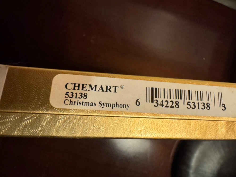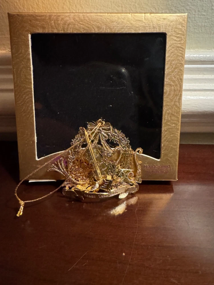 This is a round Christmas ornament by ChemArt, made of brass and handmade in the United States in 2014. The ornament features a musical instruments theme, plated in brass and includes the original packaging. It is part of the ChemArt Ornaments collection and depicts a Christmas Symphony.