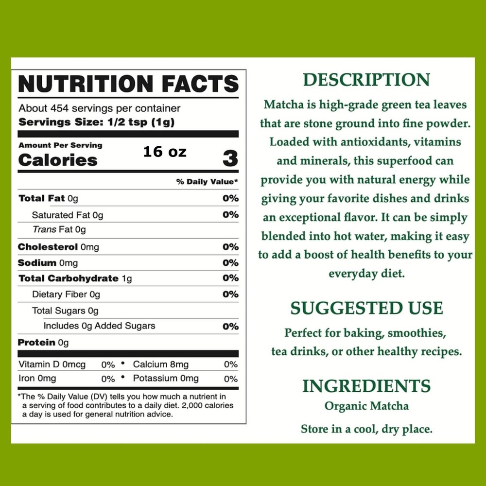 Cherie Sweet Heart Organic Matcha Green Tea Powder - Premium Culinary Grade, Authentic Japanese Origin, Antioxidant-Rich, Gluten-Free, Vegan – Perfect for Lattes, Cooking, Baking & Smoothies – 16oz Resealable Bag Product Details Number of Items: 1 Brand: Chérie Sweet Heart UPC: 850004867167 EAN: 0850004867167 MPN: Does not apply Brand: Chérie Sweet Heart Item Form: Powder Flavor: Matcha Tea Variety: Green Unit Count: 16.0 Ounce Package Dimensions : 10 x 6.89 x 1.65 inches; 1 Pounds UPC : Manufacturer : Chérie Sweet Heart Units : 16.0 Ounce Best Sellers Rank: #15,220 in Grocery & Gourmet Food (See Top 100 in Grocery & Gourmet Food) #101 in Matcha Tea #101 in Matcha Tea Customer Reviews: 4.2 4.2 out of 5 stars 1,858 ratings USDA Organic & Non-GMO Matcha High-quality, organic matcha green tea powder in a 16oz resealable pouch. No artificial flavors, colors, or additivesjust pure, natural matcha. Rich in Antioxidants & Nutrients Packed with antioxidants that support metabolism, heart health, and sustained energy for mental clarity and daily focus. Versatile for Lattes, Smoothies & Baking Perfect for matcha lattes, smoothies, baked goods, or even savory recipes. A nutrient-rich superfood to elevate your routine. Gluten-Free & Vegan Superfood Ideal for plant-based diets. This matcha is gluten-free, vegan, and sourced sustainably to support your health and the planet. Premium Matcha Taste & Quality Sourced from trusted producers, it delivers smooth texture and authentic flavor with superior quality in every scoop.