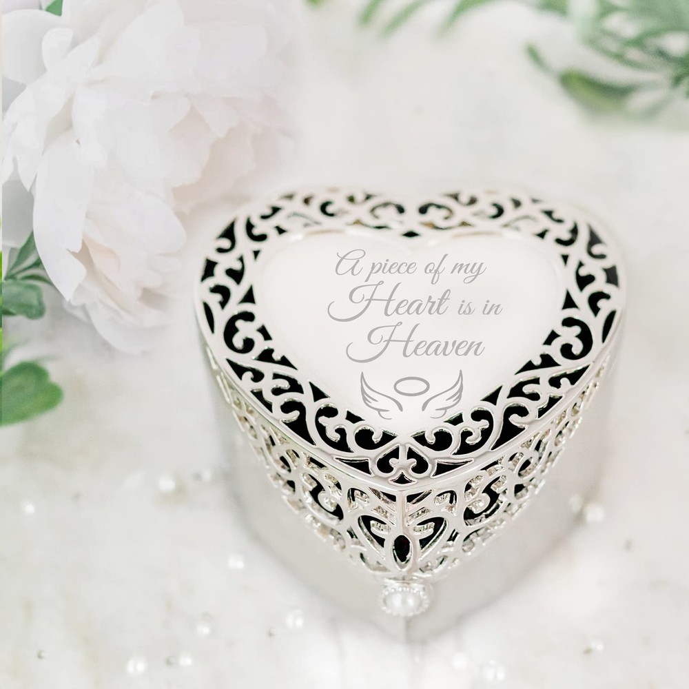 Cherished Moments Bereavement Memorial Gift Jewelry Keepsake Box with Heart-Shaped Filigree Design for Sympathy Gift Loss of Loved One, Loss of Dad, Mom, Wife, Husband, Silver Toned - Buy Now with Fast Shipping! Cherished Moments Bereavement Memorial Gift Jewelry Keepsake Box with Heart-Shaped Filigree Design for Sympathy Gift Loss of Loved One, Loss of Dad, Mom, Wife, Husband, Silver Toned Product Details Color: Silver Brand: Cherished Moments Material: Metal Style: Memorial-Filigree Special Feature: Engraved Recommended Uses For Product: Ring Product Dimensions: 3.5"D x 3"W x 2"H Target Audience: Girls Shape: Heart Finish Type: Polished Color: Silver Brand: Cherished Moments Material: Metal Style: Memorial-Filigree Special Feature: Engraved Recommended Uses For Product: Ring Product Dimensions: 3.5"D x 3"W x 2"H Target Audience: Girls Shape: Heart Finish Type: Polished Inner Material: Felt Number of Drawers: 1 Number of Compartments: 1 Jewelry Storage Type: Jewelry Box Number of Items: 1 Manufacturer: Cherished Moments Occasion: Friendship Day, Memorial Day Mounting Type: Table Top Closure Type: Pearl Part Number: SJB-Fil-Heart-04-Mem-Angel Item Weight: 10.5 ounces Country of Origin: China Finish: Polished Item Package Quantity: 1 Special Features: Engraved Batteries Included?: No Date First Available: November 4, 2022 Key Features ✅ PREMIUM QUALITY - Keep her beautiful jewelry safe and organized in this heart-shaped silver toned jewelry box with precious pearl closure. This special keepsake box measures 3.5" x 3" x 2". ✅ ENGRAVED MESSAGE This box features an engraved message "A Piece of My Heart is in Heaven" accented with symbolic angel wings. The engraving is created with our high-quality diamond tip engraver ensuring that the message is beautifully displayed. ✅ MEMORIAL GIFTInspirational sympathy gift for loss of loved one or bereavement gift in memory of mother, father, husband, family member, or friend. ✅ DETAILS Soft felt lining inside the box to protect her special treasures with a unique ring holder to store her rings. ✅ JEWELRY GIFTING -(Jewelry not included) She will love an inspirational piece of jewelry with this special box. Check out our store to see our collection of sterling silver jewelry - a Keepsake she will treasure forever! Product Description