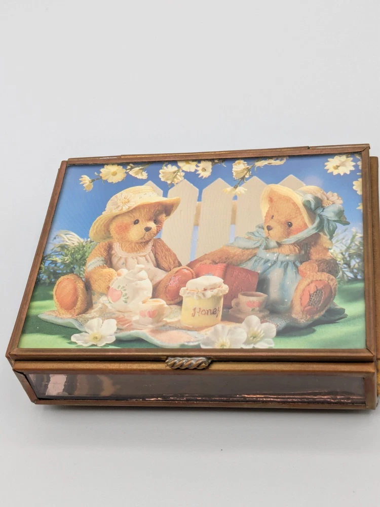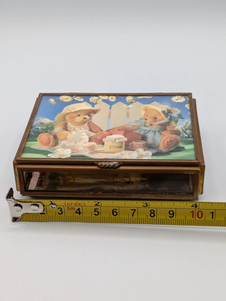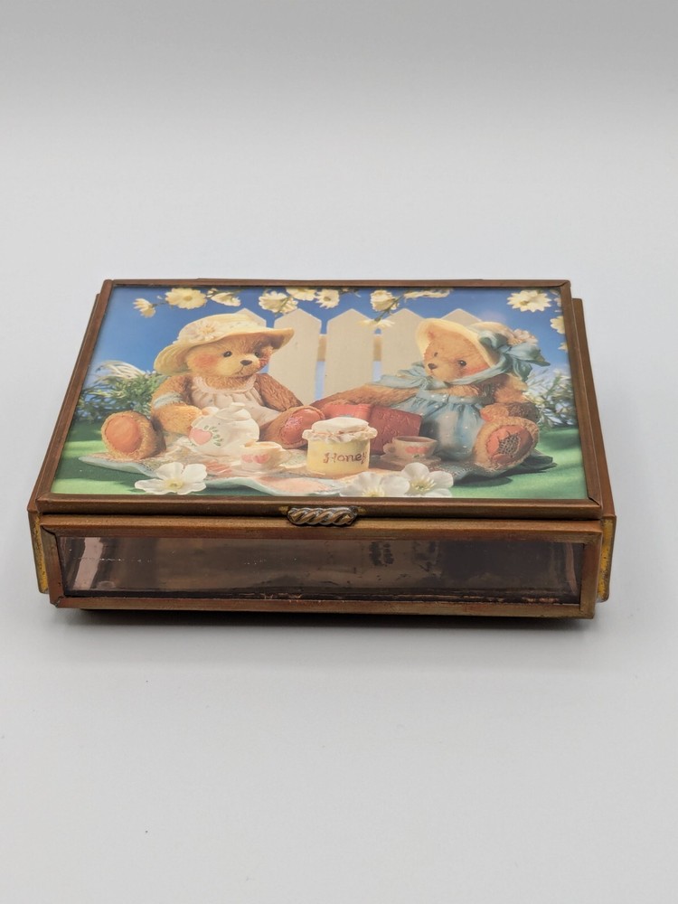 Finish: Mirrored Era: Late 20th Century (1970-1999) Color: Multicolor Type: Trinket Box Theme: Cherished Teddies Material: Glass Subject: Picnic Brand: Enesco Shape: Rectangle Occasion: All Occasions Time Period Manufactured: 1990-1999 Collection: Cherished Teddies Original/Reproduction: Original Size: Small