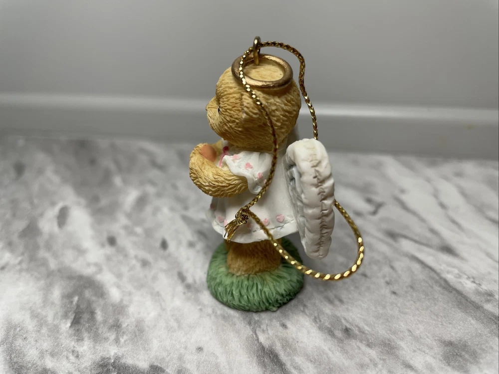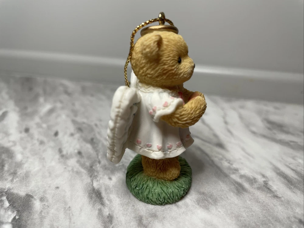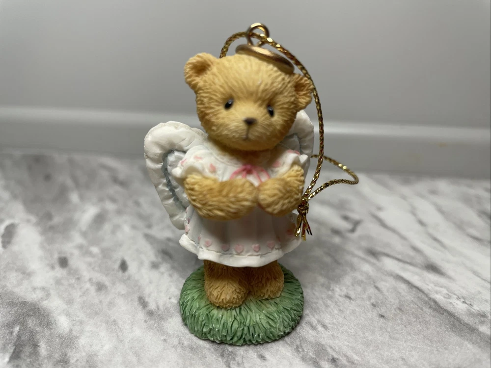 This is a Cherished Teddies Mini Ornament #118317 from Enesco. It is a small resin angel ornament designed for Christmas. Manufactured in 2003 in China, it features a hanging design and is part of a set.