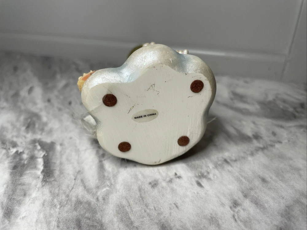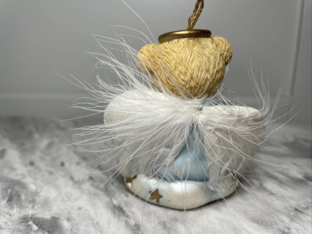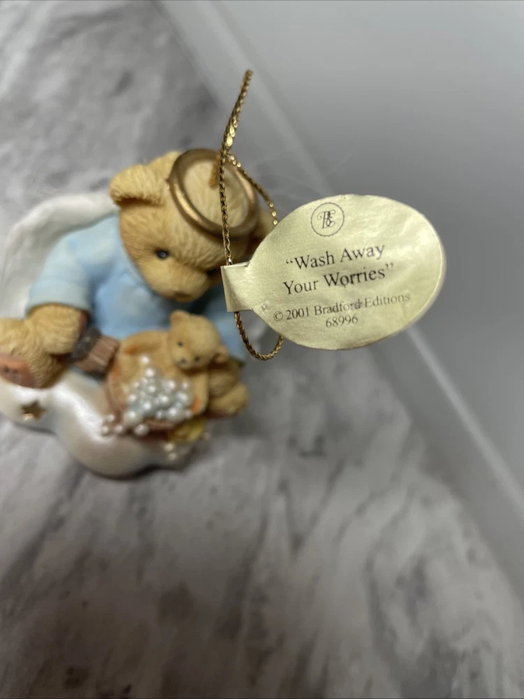 This Enesco Cherished Teddies figurine is a Christmas ornament featuring angels with the theme of "Wash Away Your Worries." Made of resin in 2001, this original piece is part of the Cherished Teddies collection. The figurine depicts an angel and is designed for holiday decoration.