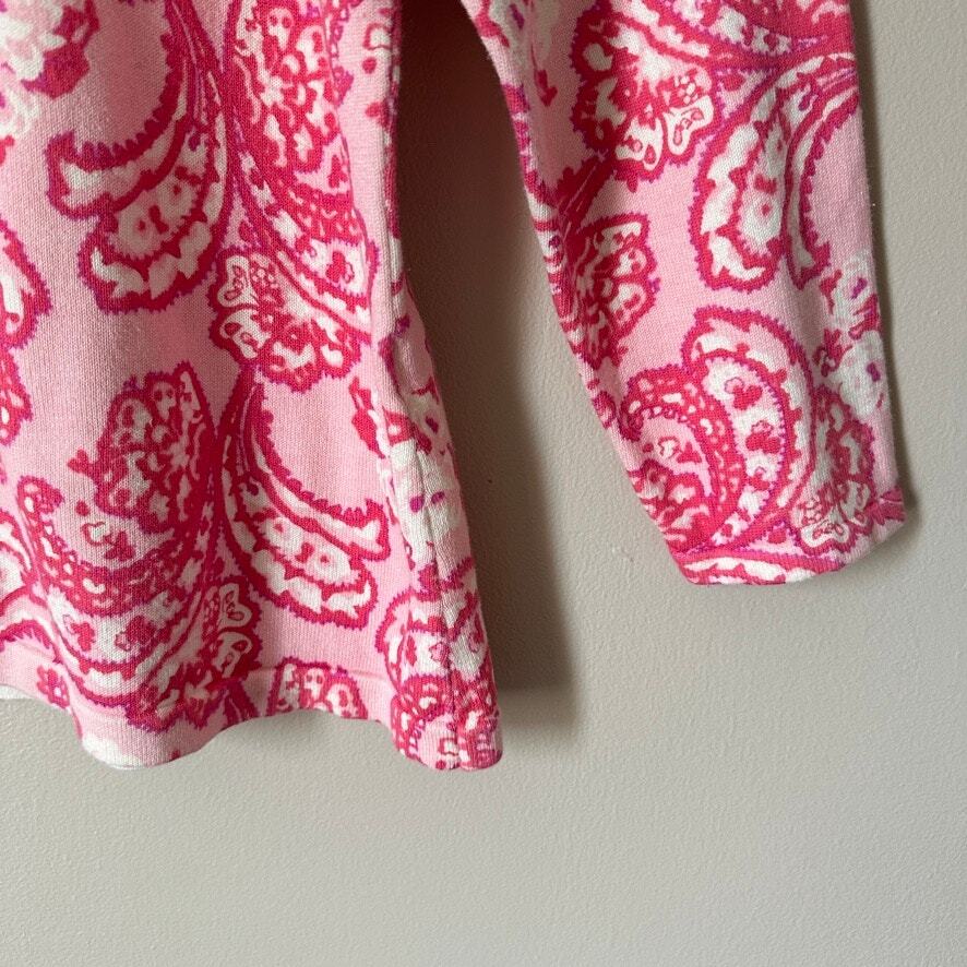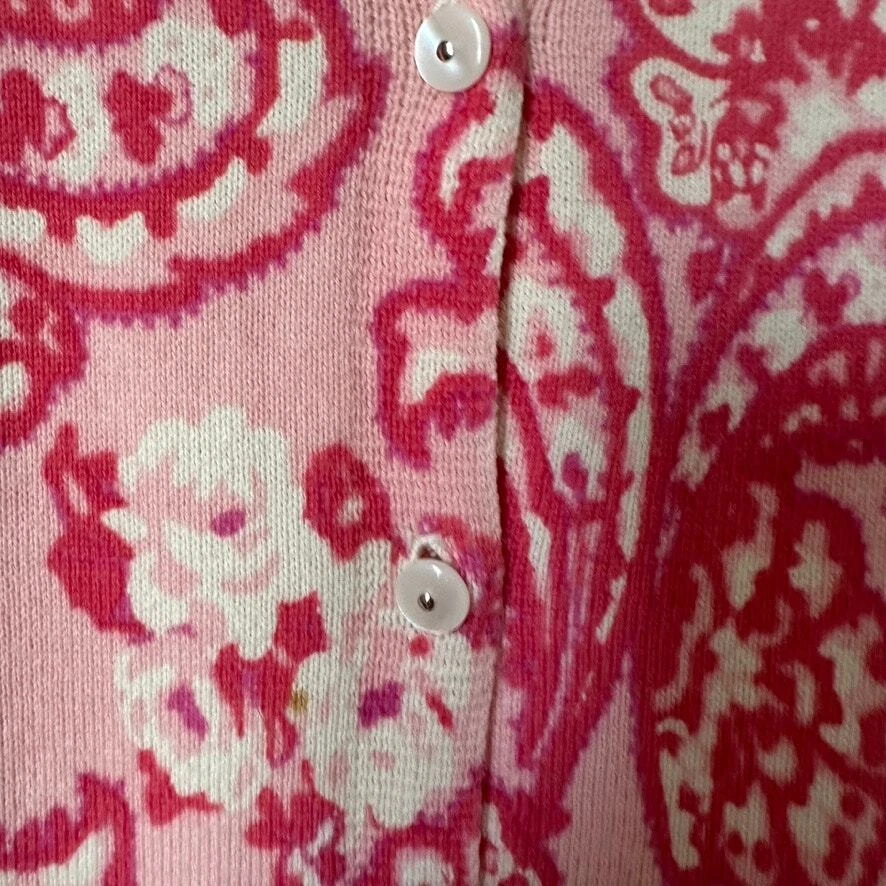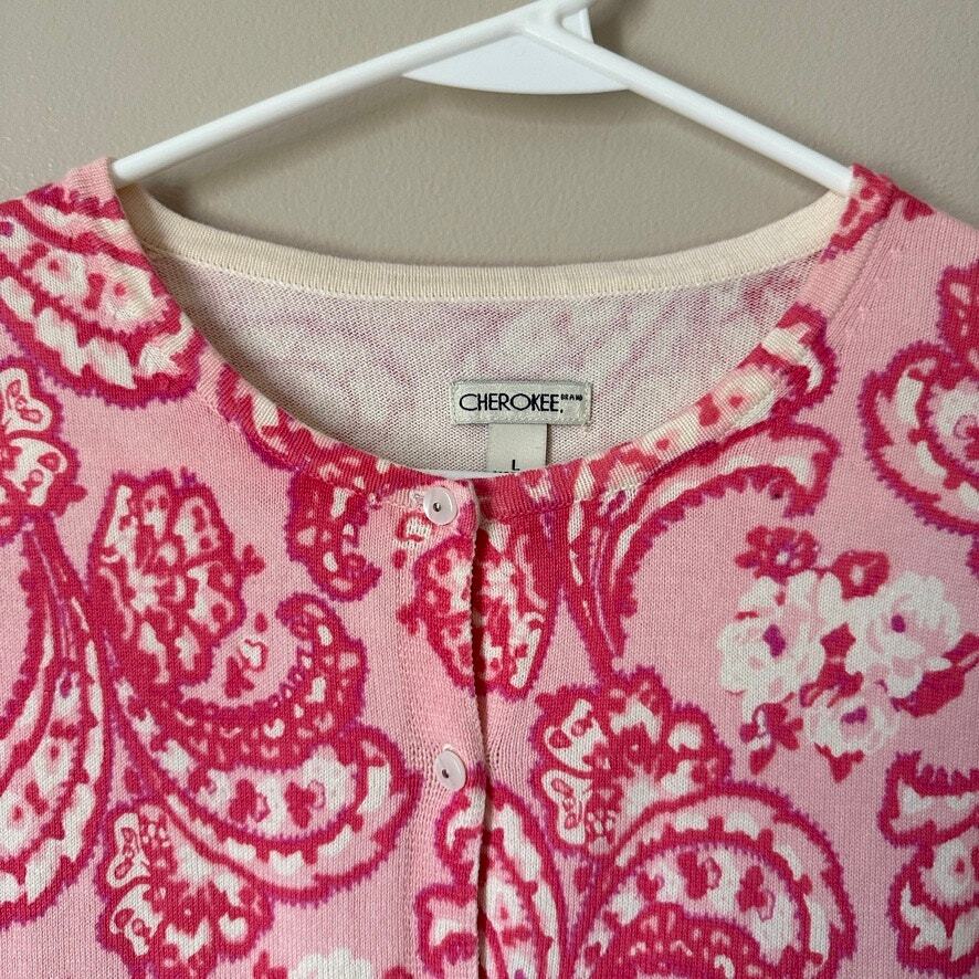 Fit: Regular Size Type: Regular Fabric Type: Knit Personalize: No Brand: Cherokee Color: Pink Occasion: Casual, Workwear, Party/Cocktail, Travel Vintage: No Accents: Button Pattern: Paisley Sleeve Type: none Country/Region of Manufacture: Australia Department: Women Sleeve Length: Long Sleeve Character: none Type: Sweater Season: Fall, Winter, Spring, Summer Size: L Neckline: Crew Neck Material: 100% Cotton Garment Care: Machine Washable Character Family: none Style: Cardigan Features: Lightweight, Breathable Theme: Bohemian, Preppy, Classic Knit Style: Tight-Knit