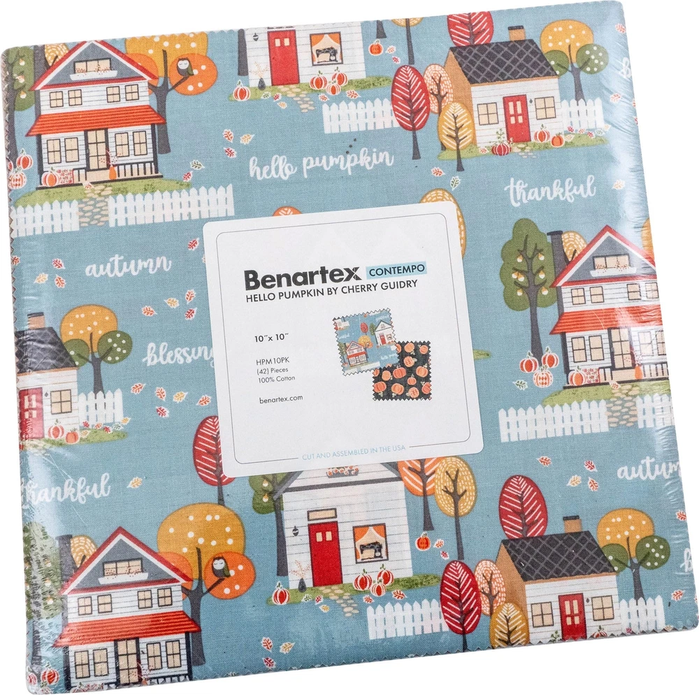 Fabric bundle of 42 10-inch squares from the Hello Pumpkin collection by designer Cherry Guidry (Cherry Blossoms Quilting) for . Take a stroll through Cherry Guidry’s charming “Hello Pumpkin" neighborhood and enjoy the warmth of Autumn. You’ll find a small-scale plaid that is perfect for binding, a sweet Fall sentiments print and a pretty mosaic, all in Cherry’s signature style. Pair them with the newest colors of Chalk Texture Basics that are the perfect accent or background for quilts, applique projects and bags. Hello Pumpkin collection from Designed by Cherry Guidry (Cherry Blossoms Quilting) 10X10 Pack (Layer Cake) includes 42 10-inch squares 100% Cotton; premium quilt shop quality fabric
