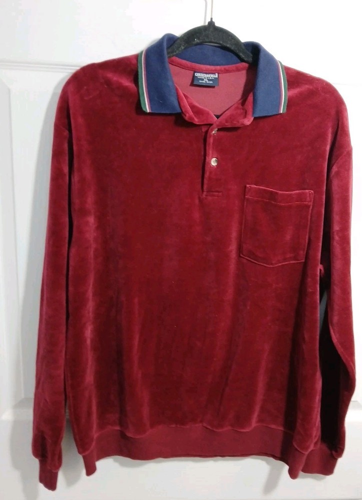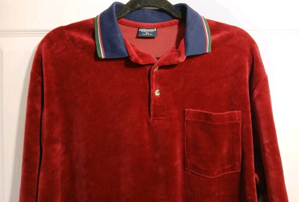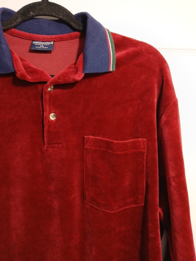 Pit to Pit 23" Length 27" * Pls note this is a beautiful burgundy color, my camera didn't do it justice** The Chesterfield Velour Long Sleeve Polo Shirt Top Sweater in XL size is a stylish and vintage-inspired piece perfect for men looking to add a touch of USA-inspired flair to their wardrobe. This burgundy color sweater features a solid pattern with a pullover style, making it easy and comfortable to throw on for any casual occasion. Made from a blend of cotton and polyester, this sweater combines classic style with modern comfort for a versatile addition to any collection.