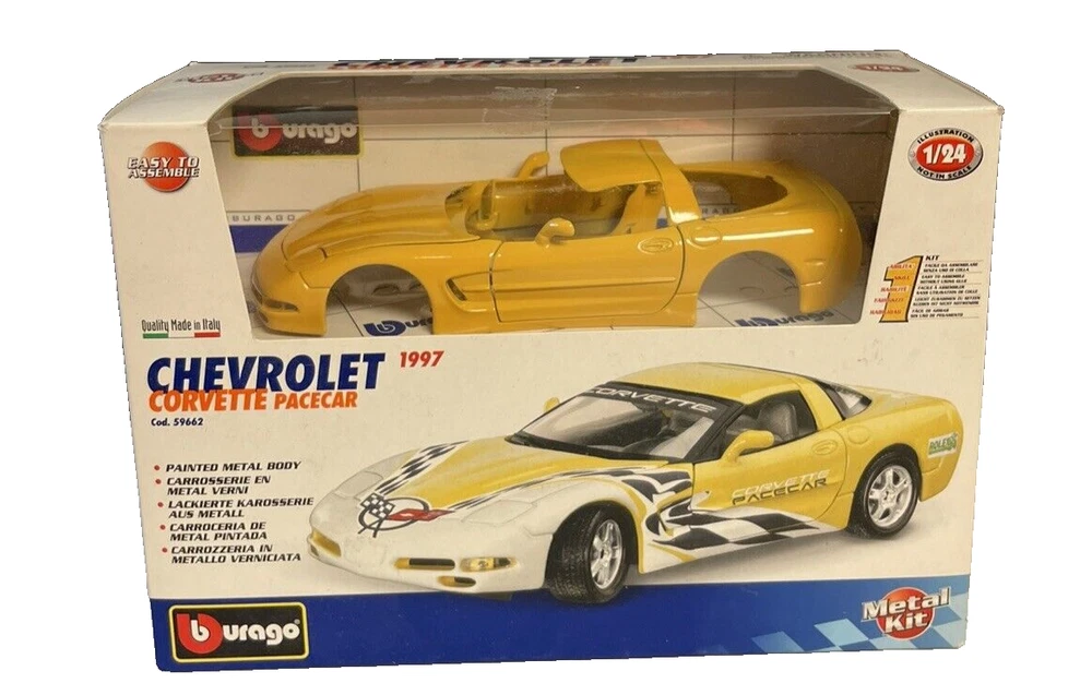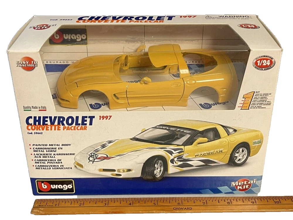 The Chevrolet Corvette Pace Car 1997 Metal Kit by Burago is a vintage unassembled car kit in 1:24 scale. This model kit features a yellow Chevrolet Corvette pace car from 1997, made of metal material. The kit includes all the necessary parts to assemble a detailed replica of the iconic Corvette, weighing 1.4 pounds. With a focus on accuracy and quality, this Burago kit is a perfect collectible for automotive enthusiasts and model builders alike. T hank you for looking. This item is from a smoke free home. Please view all the photos. Check out all my other items.