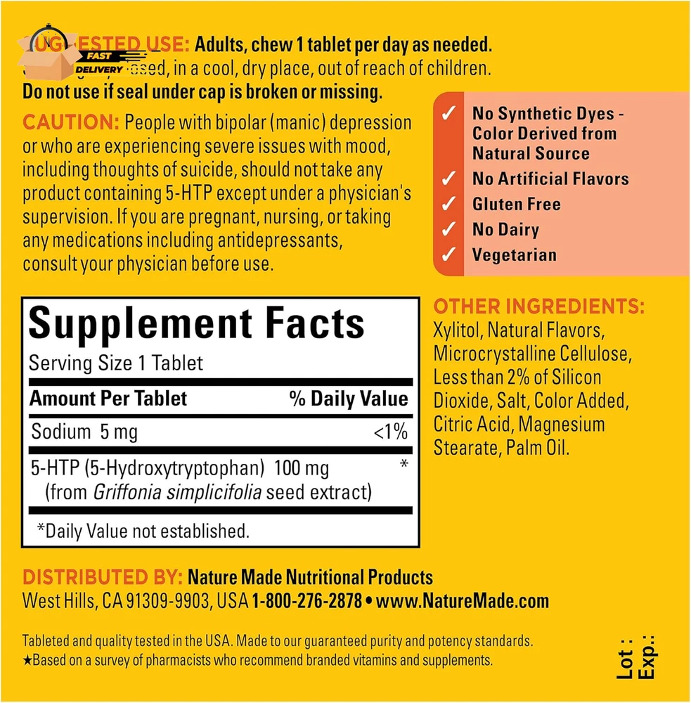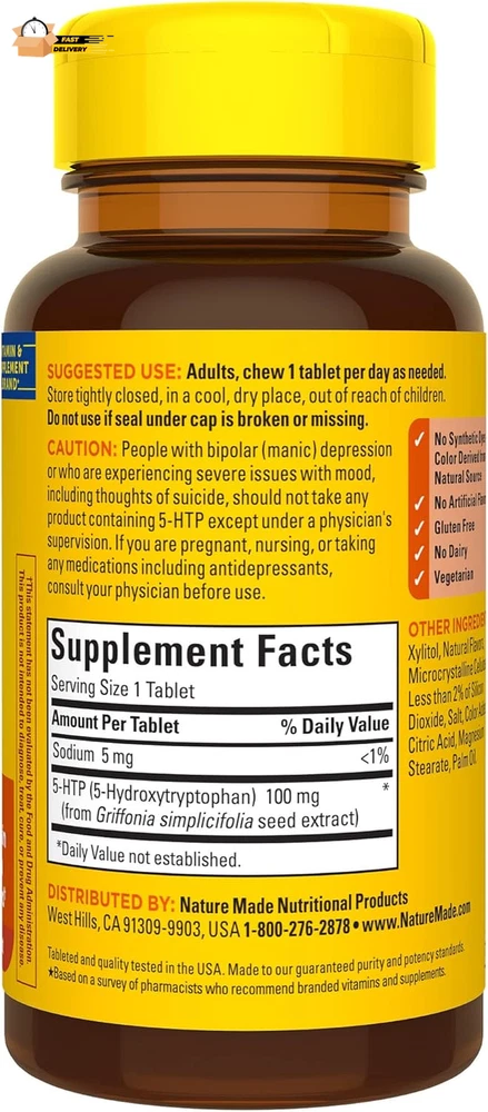 Store New Arrivals Add to Favorite View Feedback Contact Chewable 5HTP 100Mg, 5-HTP Mood Support Supplement, 30 5 HTP Chewable Tablets, Description Primary Supplement Type Vitamin Product Dimensions 2 x 2 x 4.25 inches; 1.76 ounces Country of Origin USA Flavor Name Orange Citrus Diet Type Vegetarian, Gluten Free Flavor Orange Citrus Item Form Chewable Size 30 Count (Pack of 1) Mood support supplement: contains one 30 count bottle of Nature Made 5HTP 100mg Chewable Tablets for a 30-day supply 5 HTP is an amino acid that helps make serotonin to support a positive mood (1) Delicious orange citrus flavored chewable tablets that are vegetarian and gluten free with no artificial flavors, no synthetic dyes, and no dairy Adults, chew 1 tablet per day as needed #1 Pharmacist Recommended Vitamin & Supplement Brand*; made in the USA with quality global ingredients These statements have not been evaluated by the Food and Drug Administration; this product is not intended to diagnose, treat, cure, or prevent any disease Nature Made 5HTP 100mg chewable tablets help support a positive mood (1). 5-HTP is an amino acid that helps make serotonin, which supports mood health and well-being. This gluten free 5HTP supplement has no artificial flavors, no synthetic dyes-color derived from natural source, no dairy, and is suitable for vegetarians. Adults chew one 5HTP tablet per day as needed. Start your day with Nature Made 5HTP supplements. (1) 5-HTP is an amino acid naturally produced by the body used to help make serotonin, a neurotransmitter that supports mood health and well-being. *Based on a 2022 survey of pharmacists who recommend branded vitamins and supplements. These statements have not been evaluated by the Food and Drug Administration. This product is not intended to diagnose, treat, cure, or prevent any disease. ABOUT US We offer the best prices around on high quality products. Our E-store includes media such as books, movies, music and games while offering electronics, toys, sporting apparel, clothing, tools, general home, garden items and more. SHIPPING We are always working hard to ensure your package arrives as soon as possible. Please understand that some factors like weather, high postal traffic, and the performance of shipping companies are outside of our control. We offer free shipping to the lower 48 states and ship within 2 business days of payment, usually sooner. We do not accept P.O. Boxes. Please provide a physical address. For shipping outside of the continental USA, we only use eBay's Global Shipping Program.The item is shipped to KY and then sent to the rest of the world. International customers are responsible for all duties and taxes. Continue to check out in order to calculate costs for shipping the item to your country. Messages regarding eBay's Global Shipping Program MUST be directed at eBay EXCLUSIVELY. RETURNS We offer a 30-Day Return Policy on items which you are not completely satisfied with. You have the option for a full-refund or an exchange of the item. No returns are available on items shipped outside of the USA. PAYMENT We accept PayPal. CONTACT US This page content is yet to come Please ad us to your favorite seller and visit again later Thank You CUSTOMER SATISFACTION We try our very best to make sure every customer is completely satisfied. If there's a problem, message us! We're happy to help. WE ACCEPT Copyright © 2021 AutoDS. | All Rights Reserved