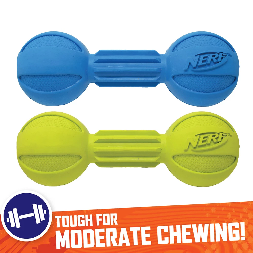 Shaped like a barbell, this design makes it easy for dogs to carry around for playtime and keeps them engaged for hours. As an added bonus, the barbell shape and ridged textures massage gums and help keep teeth clean and tartar-free! Not only is the barbell a fun dog toy, but it's also built to last! Constructed from food-heavy-duty rubber this dog toy is made with your dog's safety in mind. NERF-TOUGH: Nerf-quality materials make our Barbell Chew Toy perfect for fetch and for teaching your dog new tricks HEALTHY TEETH: The unique barbell design and ridged texture makes it easy for your dog to massage gums and help keep teeth clean and tartar-free MADE TO LAST: Lightweight, durable, and weather & water resistant FOR MEDIUM AND LARGE BREEDS: 7.5 inch barbell toy is ideal for medium and large breeds SAFETY FIRST: Designed with you dog's safety in mind, each of our dog toys are tested to ensure endless hours of family fun