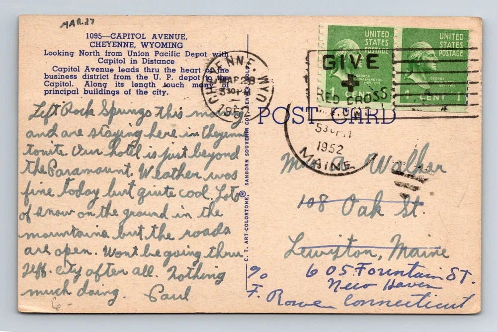 Cheyenne WY-Wyoming, Capitol Ave, Hotel, Theatre, c1952 Vintage Postcard