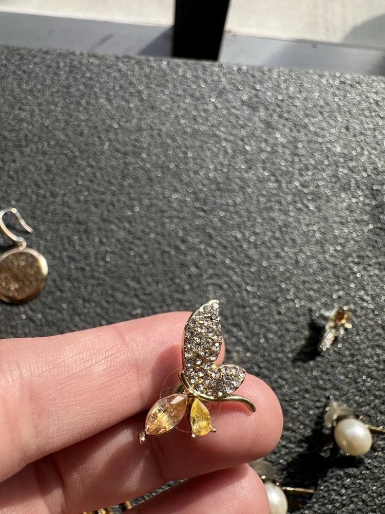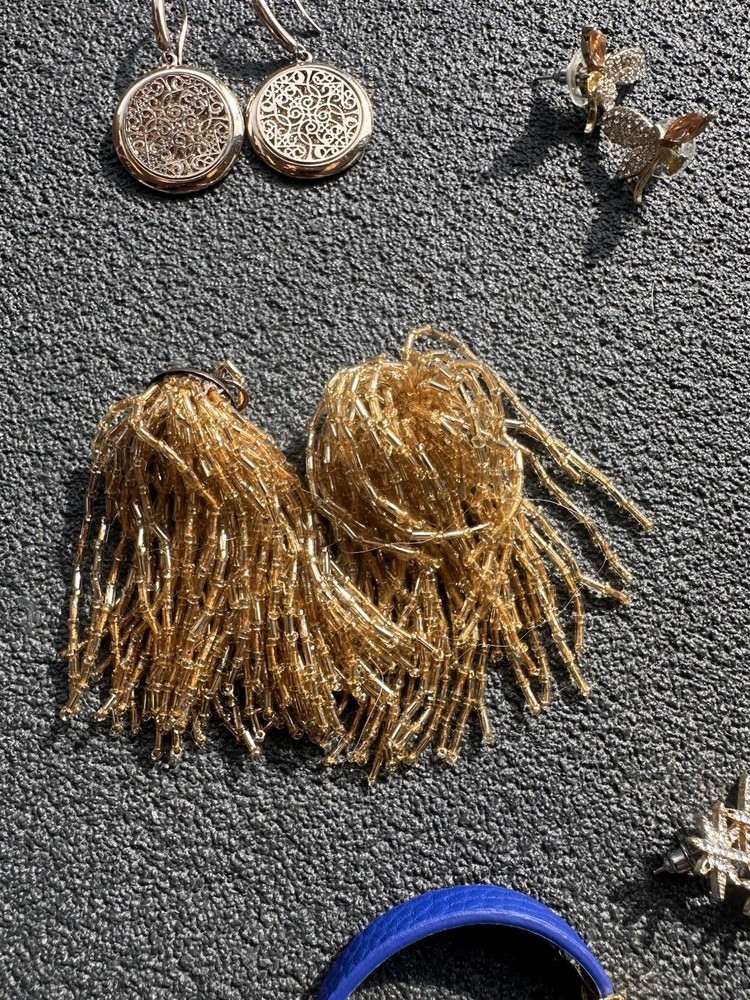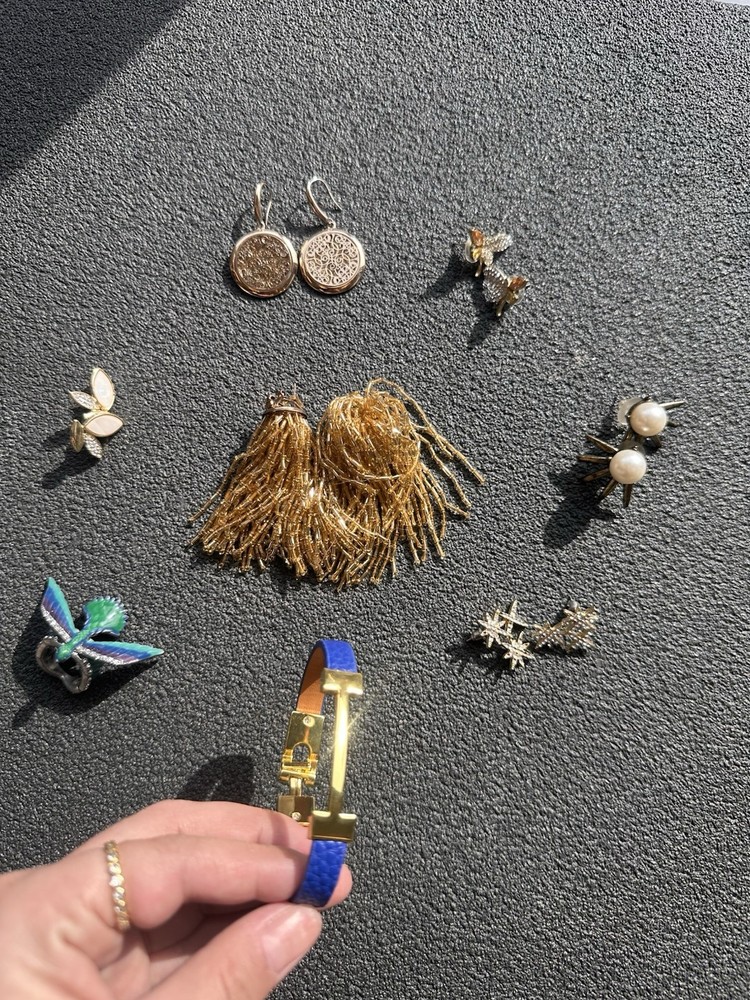 The jewelry lot includes a set of 6 earrings, a Paradise ring, and a Hermes-style bracelet, all of which offer a chic and unique style. The pieces are made of mixed materials such as glass, leather, rhinestones, and various types of metals, providing a mix of colors and textures. This fashion jewelry collection is perfect for those looking to add a touch of flair to their outfit, with a variety of accessories to choose from to suit different tastes and preferences.