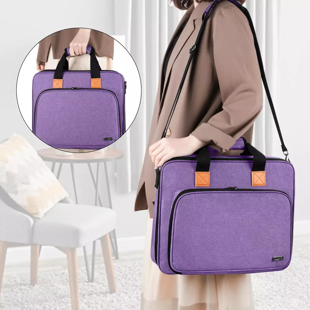 FABRIC: Crafted from durable heavy-duty nylon. NO ACCESSORIES INCLUDED. PROTECTIVE: Features thick padding sandwiched between layers of material to ensure your embroidery supplies remain in excellent condition. MAIN COMPARTMENT: Equipped with 2 inner padded sleeves designed to hold embroidery hoops (up to 11.2”) and an embroidery floss kit. Includes a spacious pocket and 2 mesh pockets for storing embroidery fabric, floss organizers, and more. FRONT ACCESSORIES STORAGE: Contains 4 elastic bands and pockets to securely hold marking pens, scissors, and similar tools. Additionally, there are 3 larger pockets for pin cushions, floss bobbins, and other essential accessories. PORTABLE: Dimensions of 15.25" x 3" x 12.5" (L x W x H) with sturdy handles and a detachable shoulder strap for convenient transport. Product Description FABRIC Constructed from heavy-duty nylon for lasting durability. Thick padding between layers protects your embroidery supplies from damage. Note: Accessories are not included with the bag. MAIN COMPARTMENT Features a large pocket and 2 mesh pockets to accommodate embroidery fabric, floss organizers, and other supplies. Includes 2 inner padded sleeves for safely storing embroidery hoops (up to 11.2”) and your embroidery floss kit. Designed with 4 elastic bands and pockets to secure marking pens, scissors, and other tools. 3 additional larger pockets are available for pin cushions, floss bobbins, and various accessories. ACCESSORIES STORAGE A back pocket is provided for storing small accessories, with the option to also store the shoulder strap. Dimensions: 15.25" x 3" x 12.5" (L x W x H). Equipped with sturdy handles and a detachable shoulder strap for easy carrying.