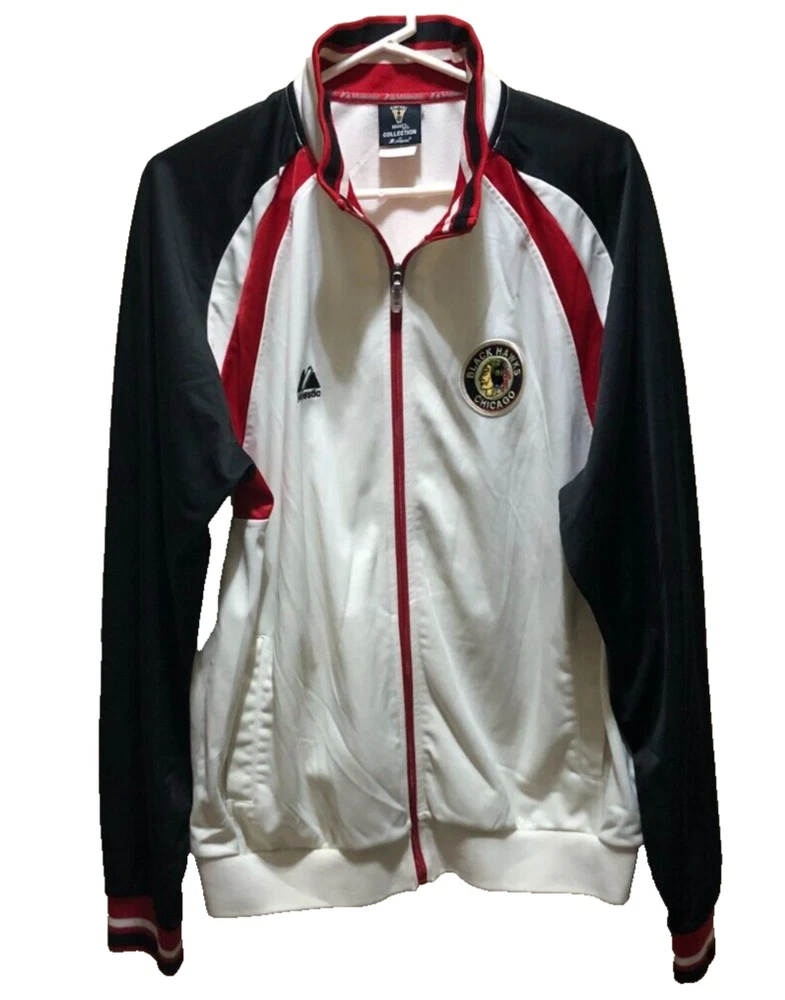 Vintage 90s NHL Official Licensed Product Majestic Vintage Hockey Collection Chicago Blackhawks Team Logo Track Jacket *100% Polyester *Embroidered / Sewn / Stitched *Color: White Size: Adults XL Approximately Measurements: *Armpit to Armpit 25" *Shoulder to Hemline 27" *Shoulder to Shoulder Condition: Pre-owned.