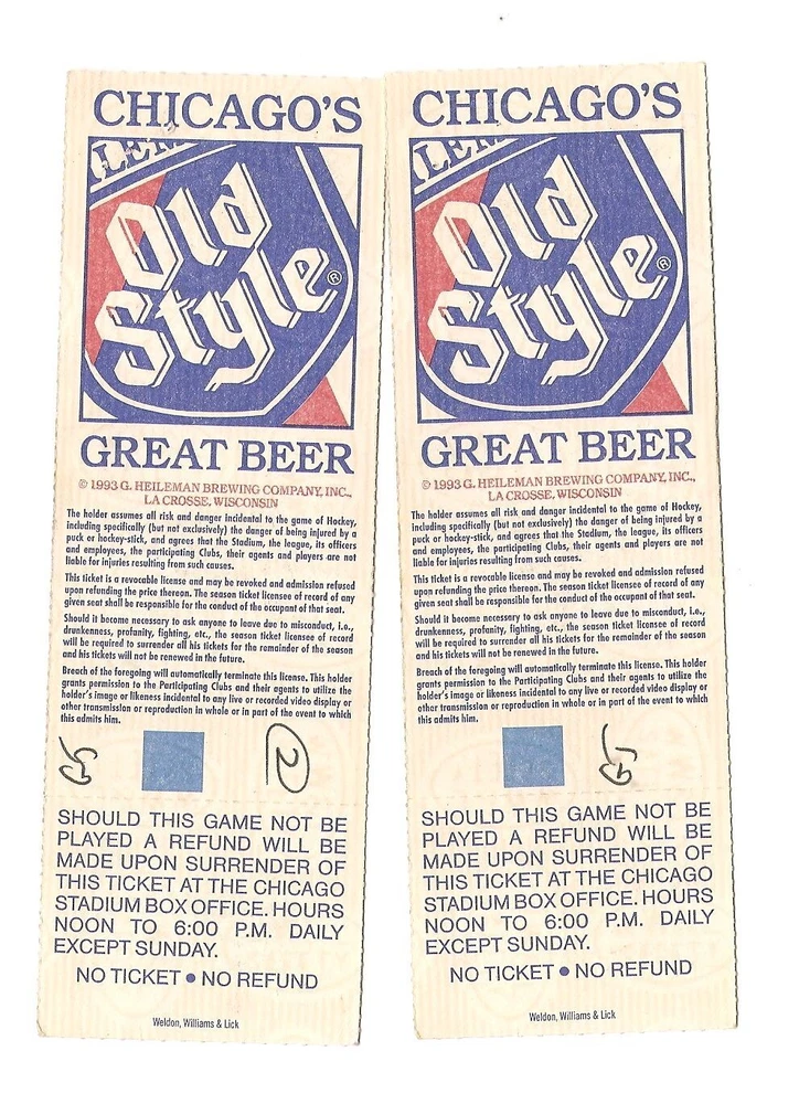 Chicago Blackhawks vs Winnipeg Jets Unused Hockey Tickets From October 10, 1993 Here are 2 unused Chicago Blackhawks vs Winipeg Jets Hockey Tickets from October 10, 1993. The game took place at The Chicago Stadium in Chicago, Illinois. The tickets are in good condition and would make an excellent addition to your collection. Payment Payment is due within 24 hours of sale. Shipping Your item will be shipped within 24 hours of receipt of payment via US Mail. The cost of shipping is $5.50 per item. Terms and Conditions All Sales are final. No Refunds
