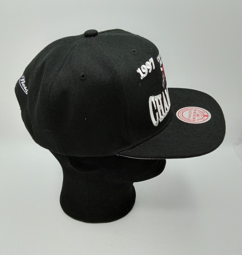 NWT. Show off your love for the Chicago Bulls with this Mitchell & Ness snapback cap. The black cap features the iconic Bulls logo in embroidered form, along with the 1997 NBA Champions with years 91, 92, 93 and 96. This unisex adult hat is perfect for any Bulls fan and is made in China with high-quality materials. The snapback size ensures a comfortable and secure fit for all head sizes. Whether you're hitting the streets or just lounging at home, this cap is a must-have for any true Bulls fan. HAT BOX 6 - 1316