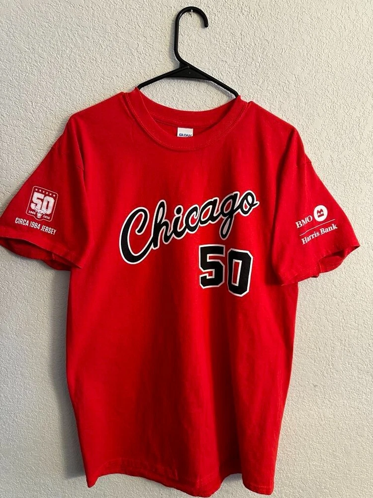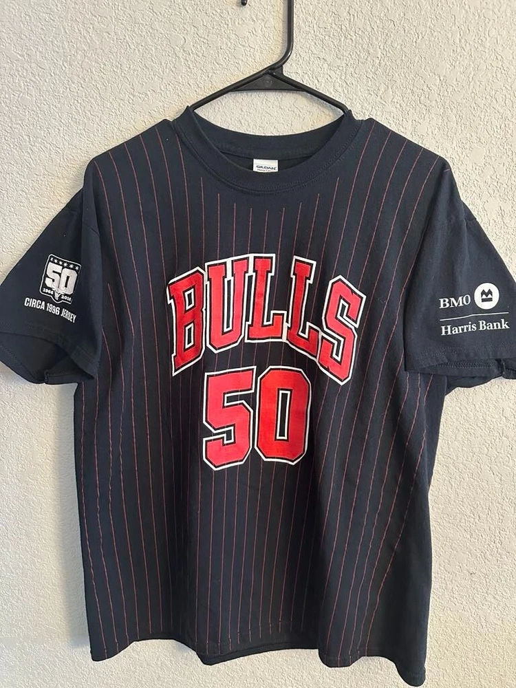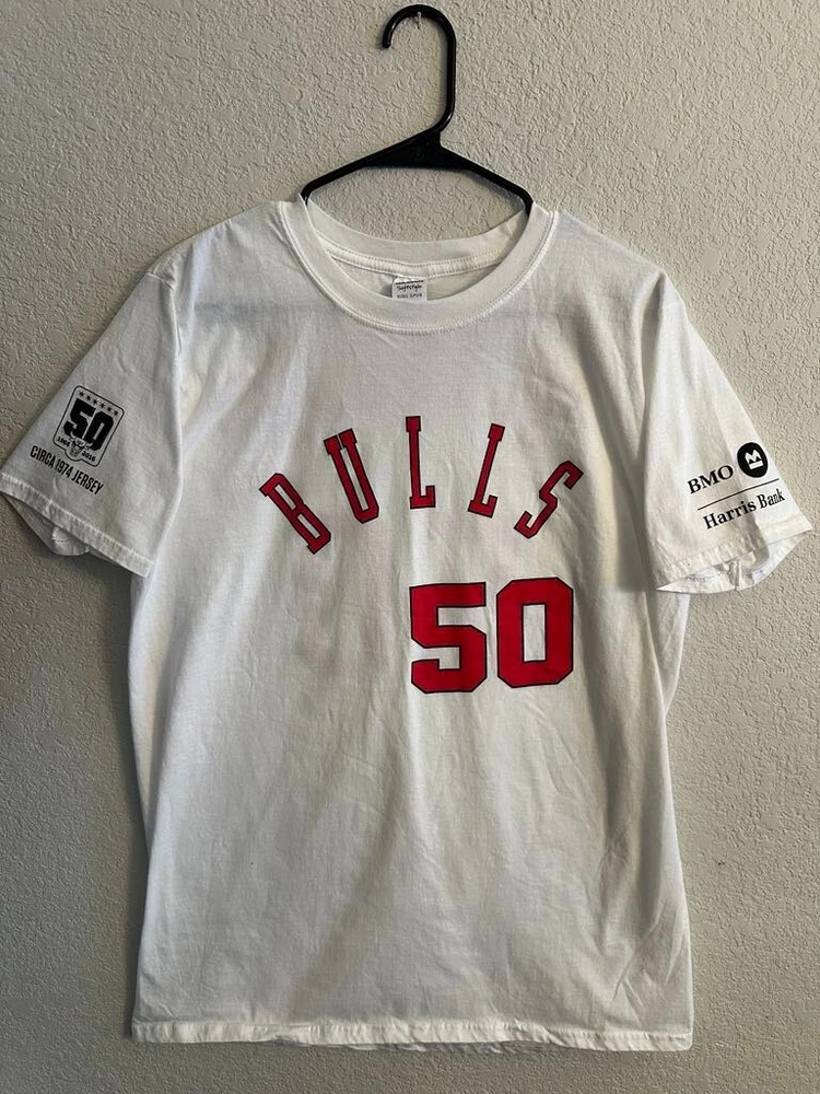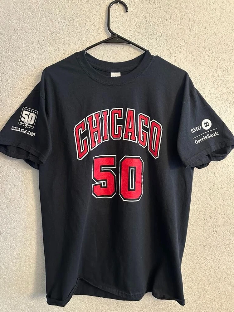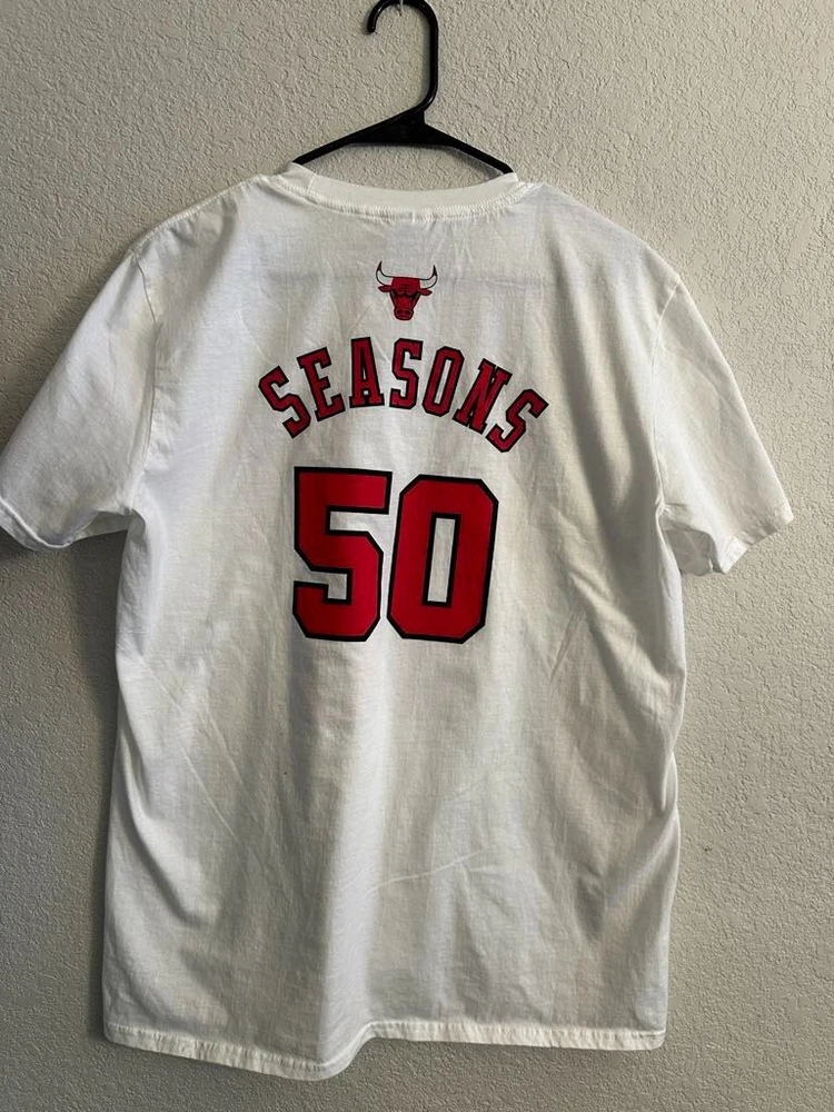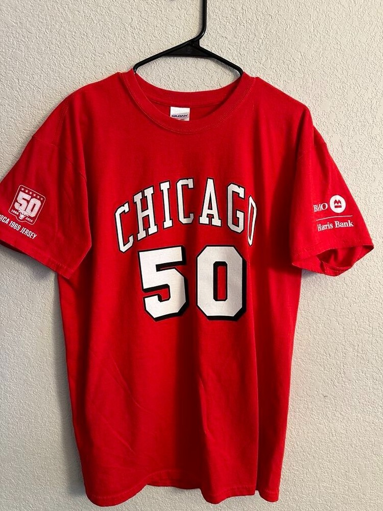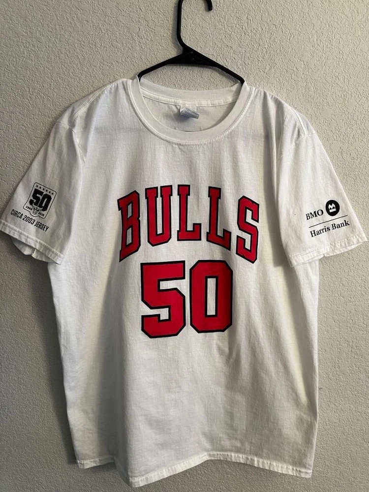 Celebrate half a century of hoop history with the Chicago Bulls NBA 50th Season Jersey-inspired T-shirts! Each T-shirt draws inspiration from the teams jerseys from each decade! - 1969 - 1974 - 1984 - 1996 - 2003 - 2016 All T-shirts are Gildan Brand and Size Large! Only 1 of each design available! NEW / Never Used or Worn / Smoke Free Home