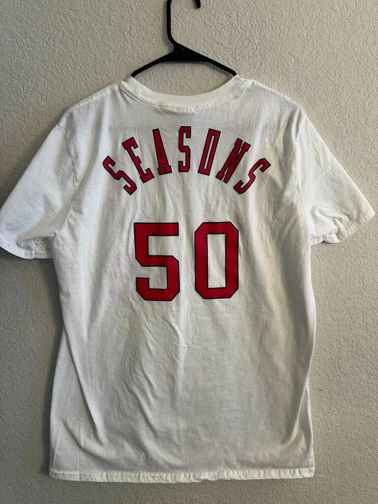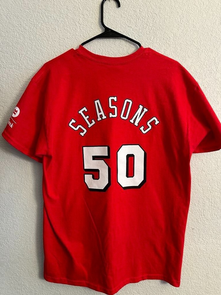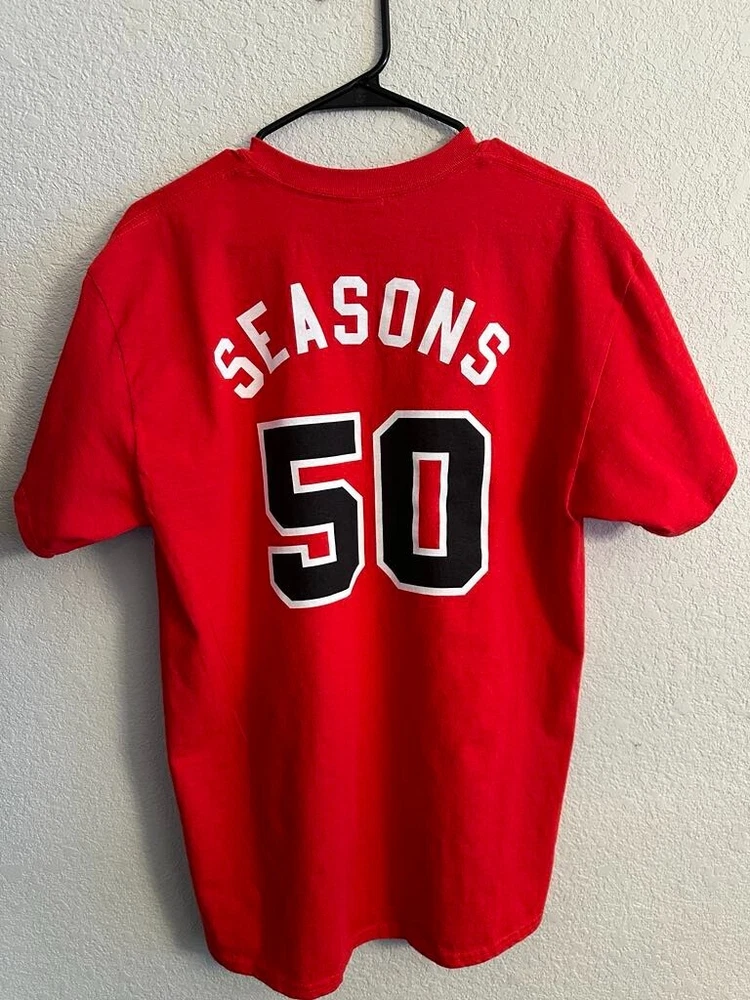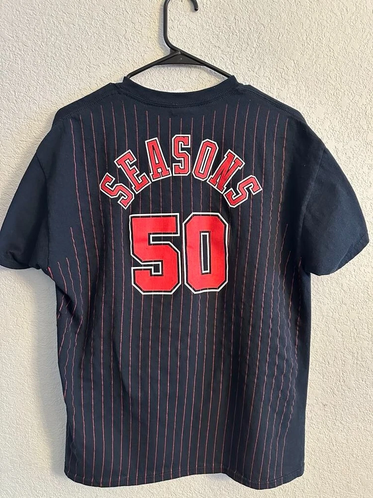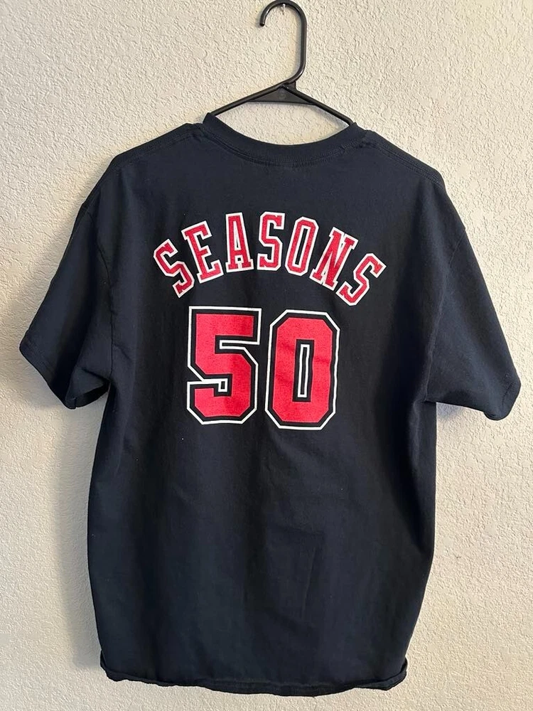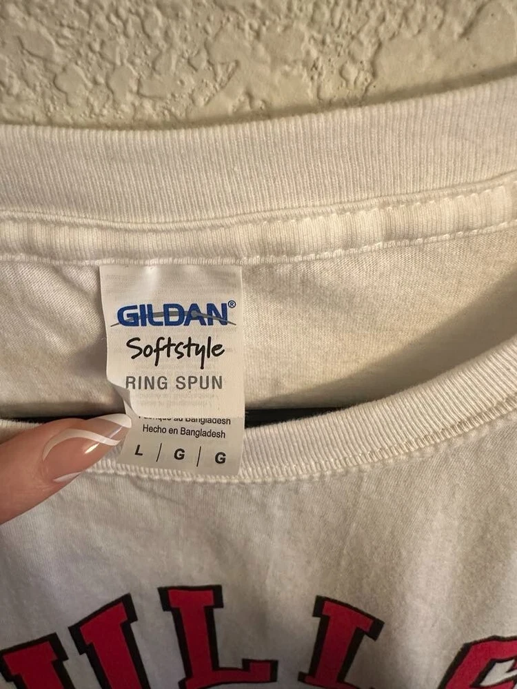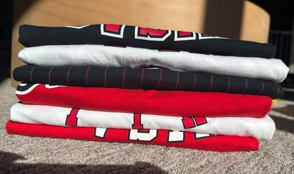 Celebrate half a century of hoop history with the Chicago Bulls NBA 50th Season Jersey-inspired T-shirts! Each T-shirt draws inspiration from the teams jerseys from each decade! - 1969 - 1974 - 1984 - 1996 - 2003 - 2016 All T-shirts are Gildan Brand and Size Large! Only 1 of each design available! NEW / Never Used or Worn / Smoke Free Home