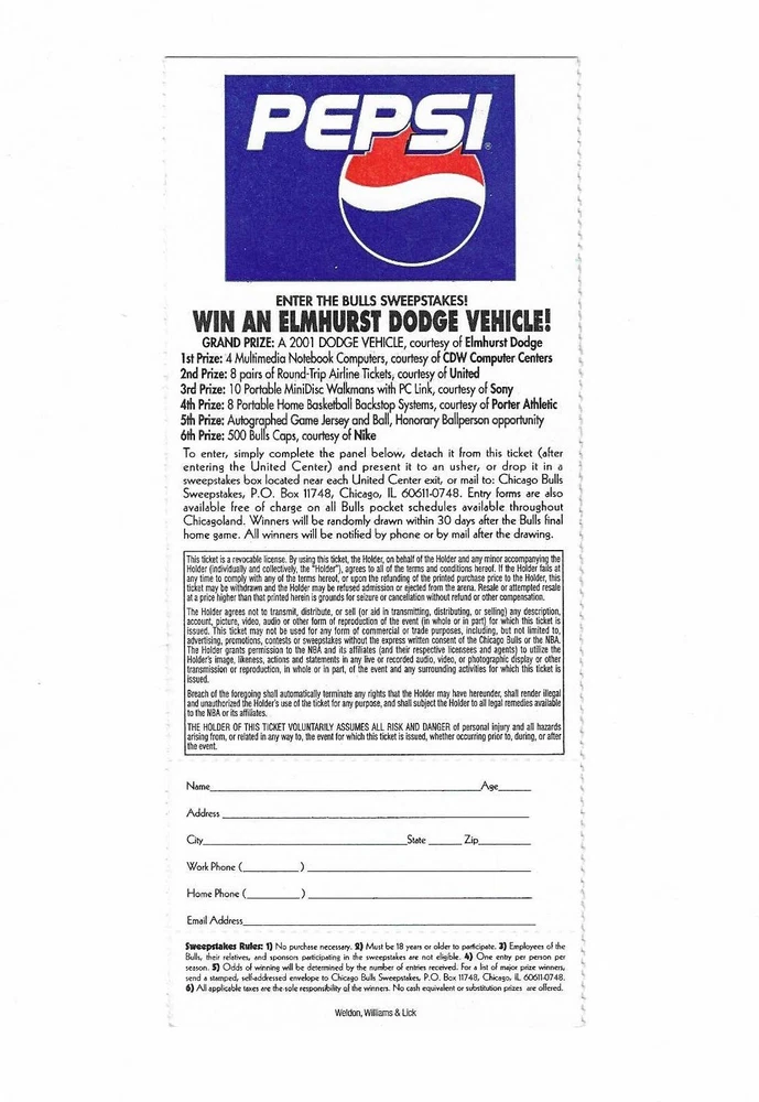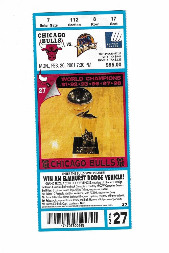 Chicago Bulls vs Golden State Warriors Unused Basketball Ticket From February 26, 2001 Here is 1 unused Chicago Bulls vs Golden State Warriors unused Basketball Ticket from February 26, 2001. The game took place at The United Center in Chicago, Illinois. The ticket is in good condition and would make an excellent addition to your collection. Payment Payment is due within 24 hours of sale. Shipping Your item will be shipped within 24 hours of receipt of payment via US Mail. Terms and Conditions All Sales are final. No Refunds