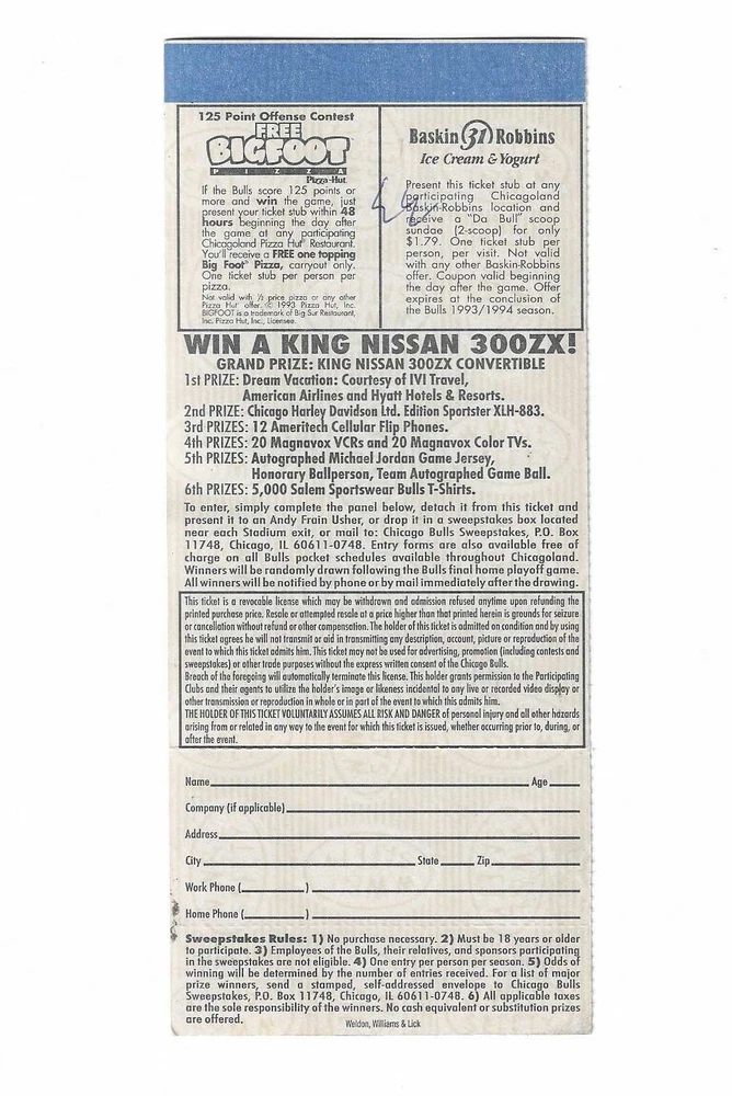 Chicago Bulls vs Los Angeles Lakers Unused Basketball Tickets From March 2, 1994 Here are 2 unused Chicago Bulls vs Los Angeles Lakers Basketball Tickets from March 2, 1994. The game took place at The Chicago Stadium in Chicago, Illinois. The tickets are in good condition and would make an excellent addition to your collection. Payment Payment is due within 24 hours of sale. Shipping Your item will be shipped within 24 hours of receipt of payment via US Mail. Terms and Conditions All Sales are final. No Refunds