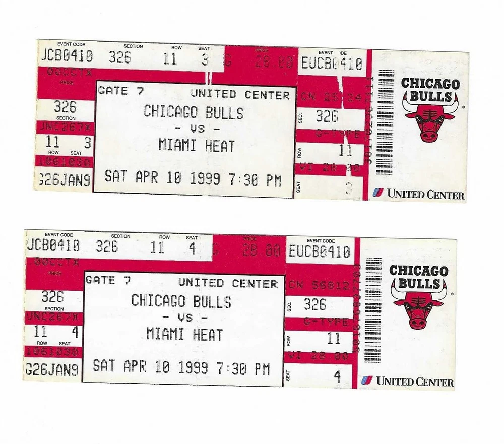 Chicago Bulls vs Miami Heat Unused Basketball Tickets From April 10, 1999 Here are 2 unused Chicago Bulls vs Miami Heat Basketball Tickets from April 10, 1999. The game took place at The United Center in Chicago, Illinois. The tickets are in fair condition and would make an excellent addition to your collection. Payment Payment is due within 24 hours of sale. Shipping Your item will be shipped within 24 hours of receipt of payment via US Mail. Terms and Conditions All Sales are final. No Refunds