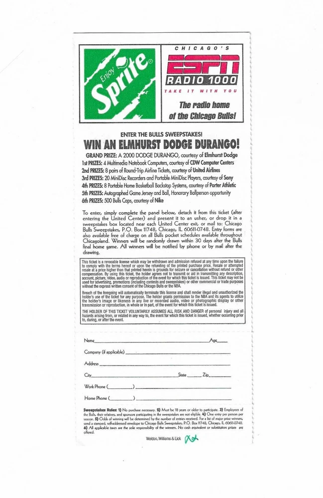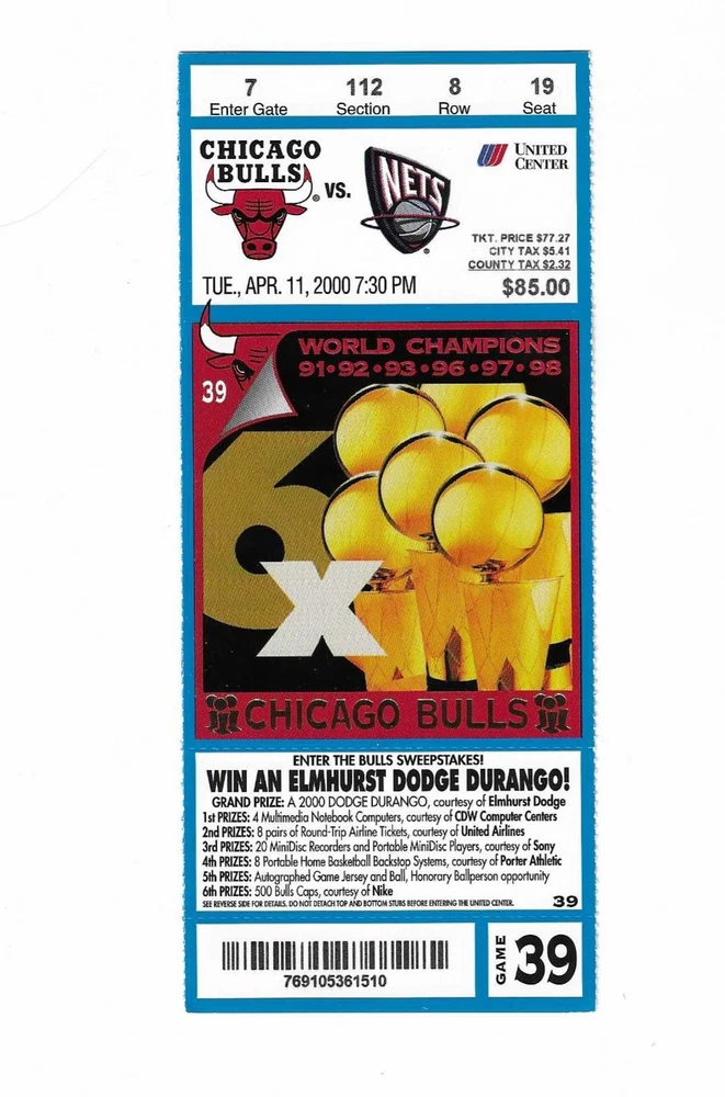 Chicago Bulls vs New Jersey Nets Unused Basketball Ticket From April 11, 2000 Here is 1 unused Chicago Bulls vs New Jersey Nets unused Basketball Ticket from April 11, 2000. The game took place at The United Center in Chicago, Illinois. The ticket is in good condition and would make an excellent addition to your collection. Payment Payment is due within 24 hours of sale. Shipping Your item will be shipped within 24 hours of receipt of payment via US Mail.